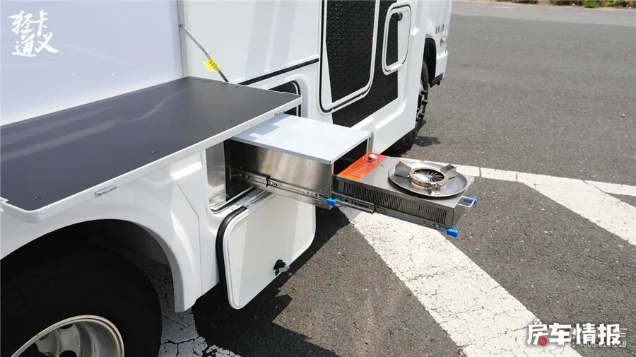 车身外部同样提供了齐全的外部生活设备,如遮阳棚、外置抽拉柴油灶、置物翻板、外部电源插座等,提升了日常使用的便利性。车尾部预留了拖车方口和摩托车架安装口,整车还带有3.5吨的牵引资质。