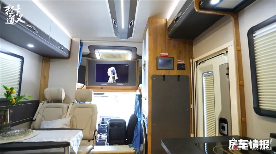 到了天热的时候,在车尾部设置了一台48v直流变频分体中央空调以及新风系统,中央空调通过风道将冷风导入各个分区,制冷更均匀,分区也可以独立关闭,降低了风口和风机的风噪,运行噪音更低。比起传统的主机式空调使用更舒适。