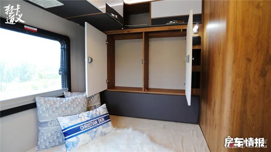 继续往车后方看,车尾部提供了一张尺寸约为2100*1200mm的横置双人床,睡下两名成年人问题不大,尾床的内侧还设置了一组进深达到了30cm的储物柜,便于存储旅行中的衣物和被褥,不过日常使用的时候要注意避免磕碰。