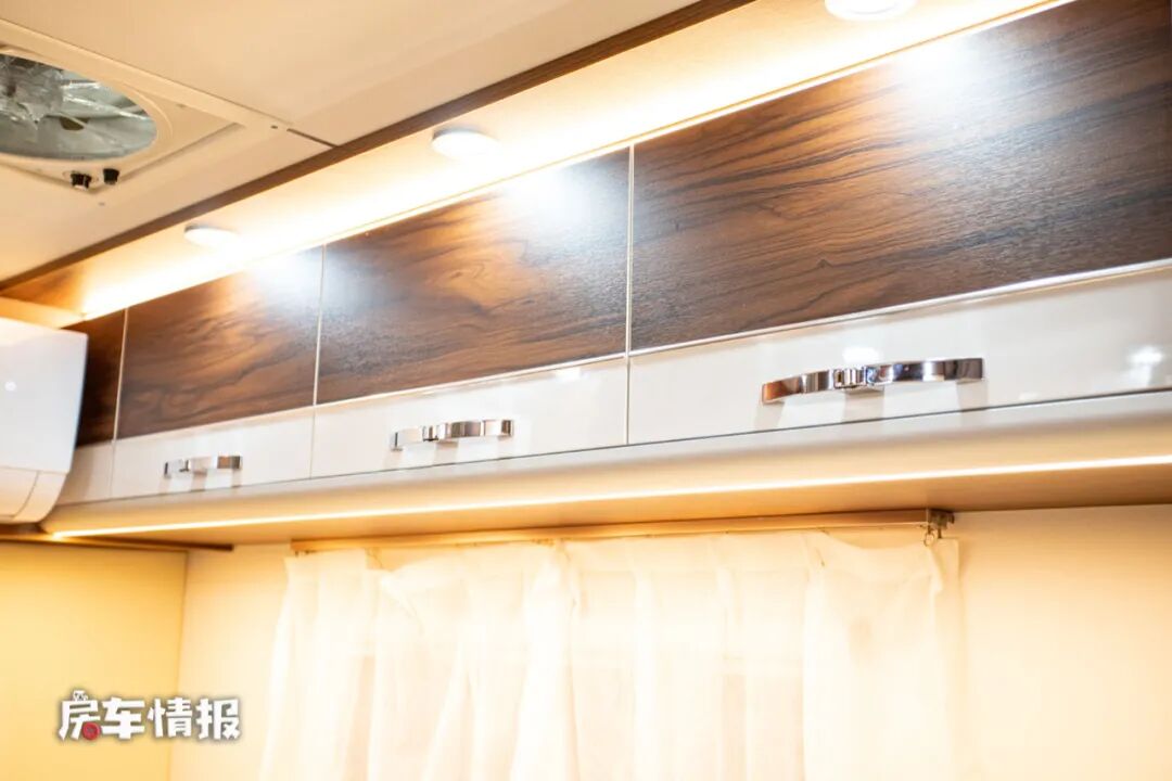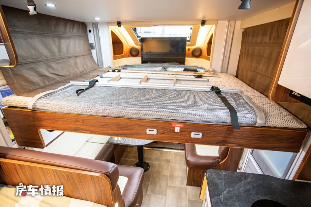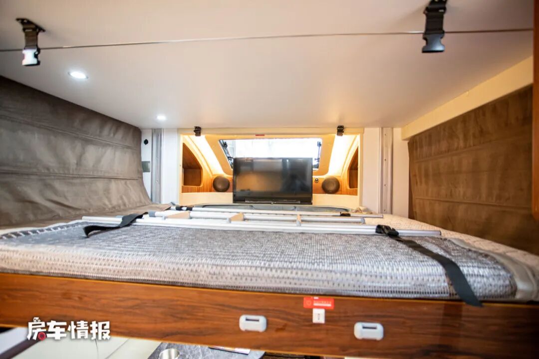 除去尾床之外,在前方的会客区上方还提供了一张电动的升降双人床,尺寸为2000mm*1300mm,完全可以容纳两个成年人休息使用,双人床采用一键式升降的设计,平时也不占用生活空间,晚上又能提供休息区域,操作也简单,设计的非常人性化。