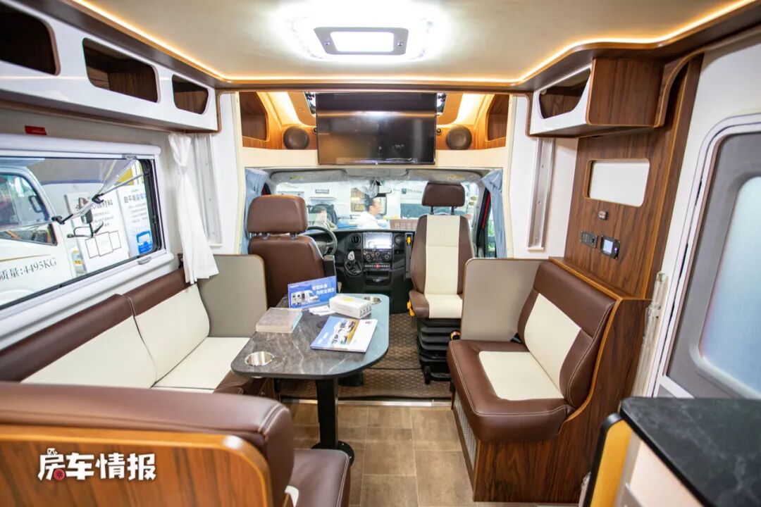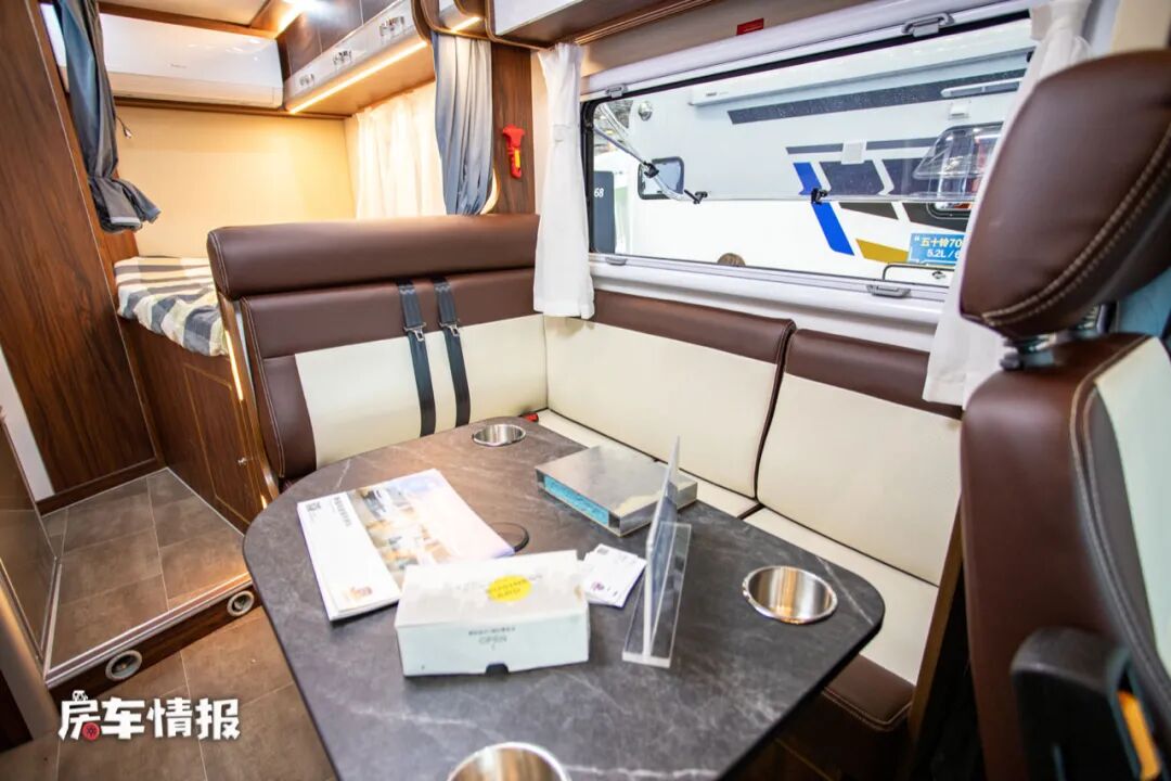 驾驶室后方是全车的会客区,采用了L型+单人沙发座椅的布局形式,中间则提供了一张可升降的餐桌,会客区整体的空间也比较宽敞,可以容纳5-6人在这里吃饭小聚。