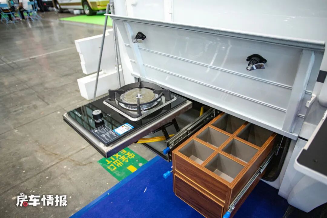 乘客门后侧是全车的厨房区,台面的左边提供了一个电磁炉,右边提供了一个翻盖式的不锈钢洗菜池,另外在橱柜的侧面还带有一个可折叠的小桌板,增大了原始台面的尺寸,使用起来更加方便。