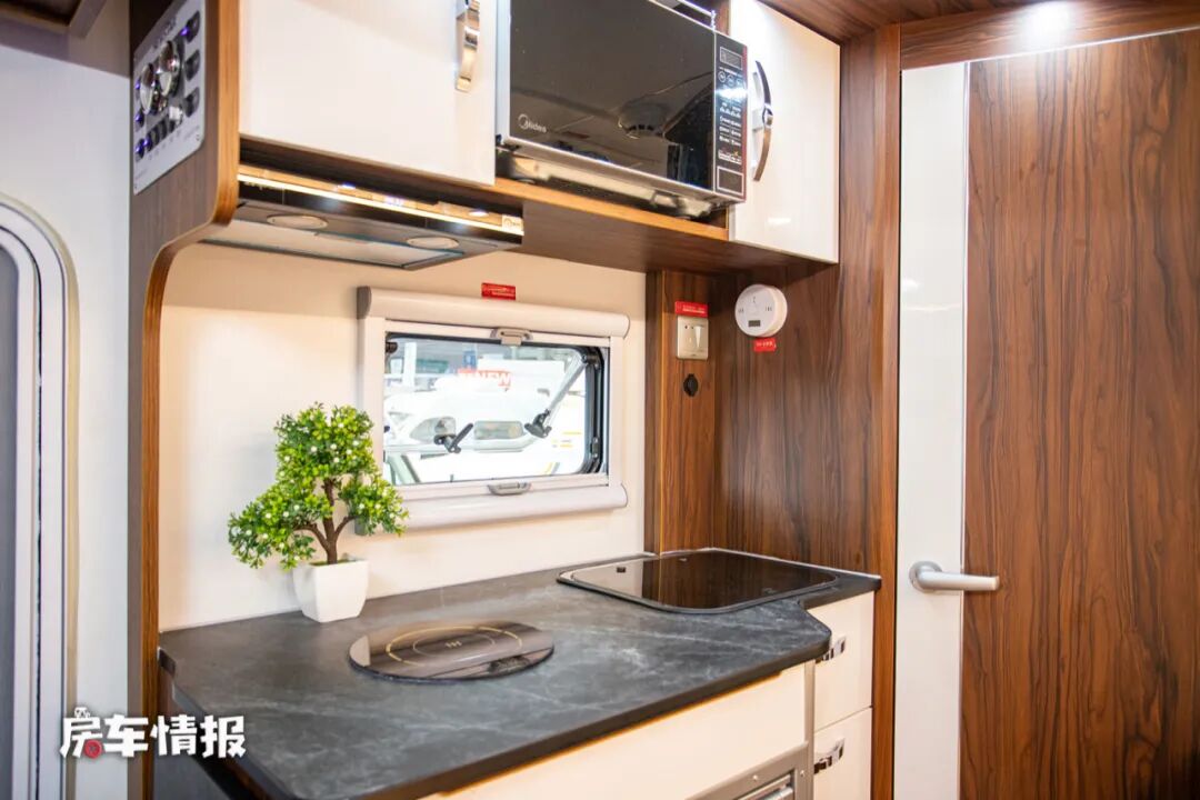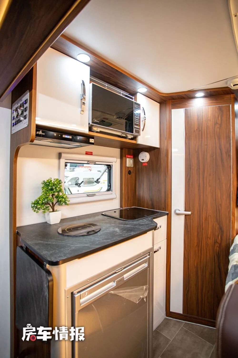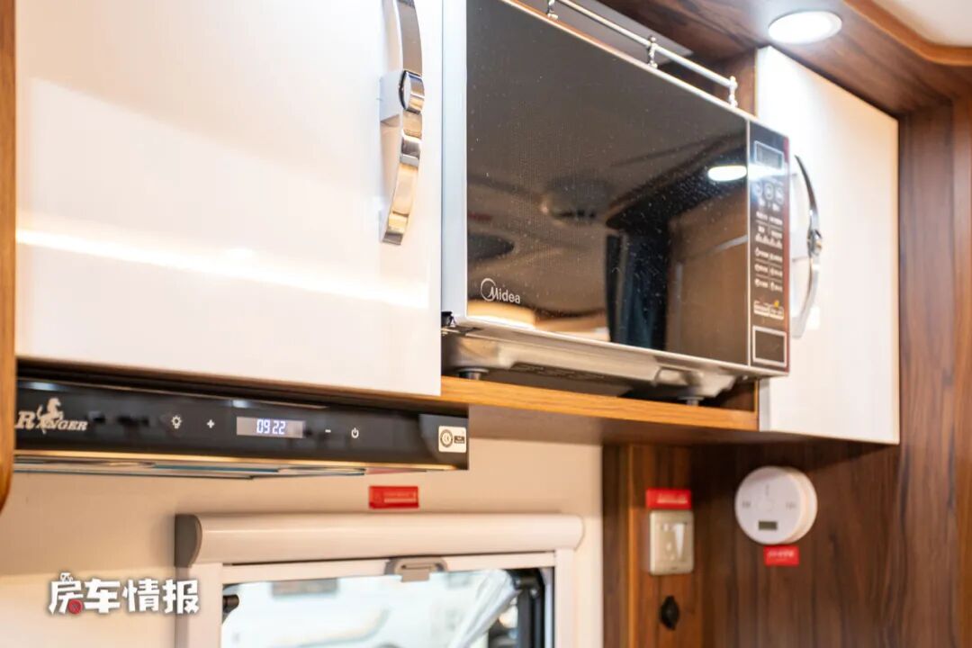 台面下方提供了一个110L的车载冰箱和多个储物抽屉。上方不仅配备了一台抽油烟机,还提供了两个大号的储物吊柜,中间嵌入了一台微波炉,整体的配置比较齐全,能够满足日常做饭的需求。