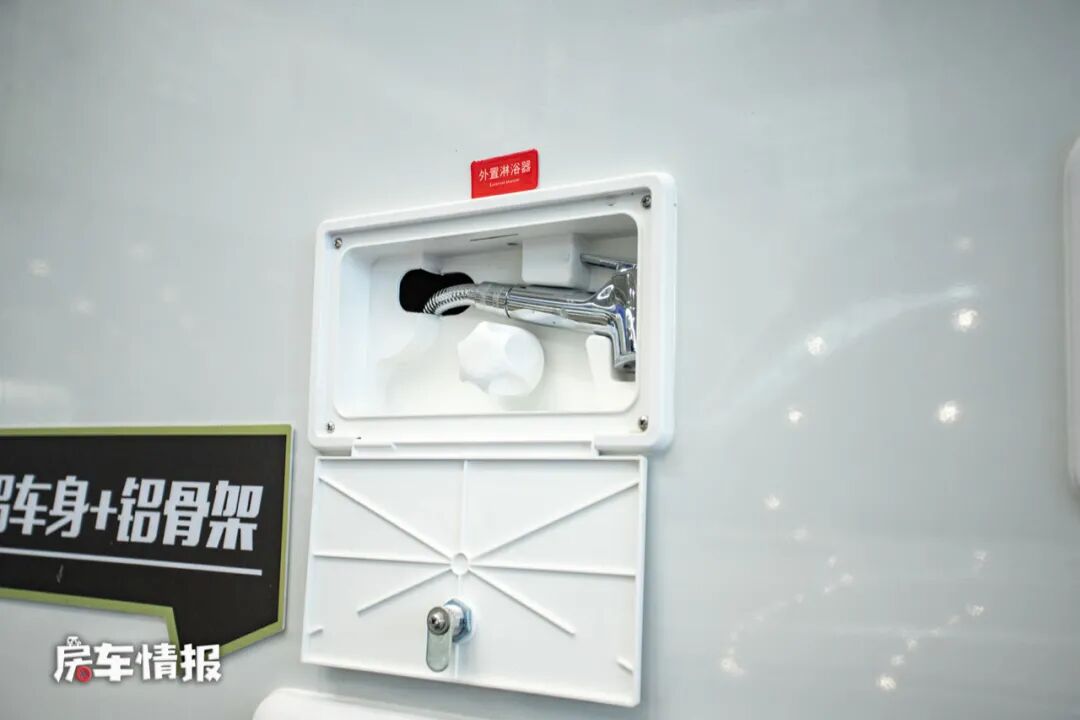 全车的外配设施也非常的齐全,包括车身右侧上方的遮阳蓬、下方的抽拉式燃气灶和抽拉式储物格,中部的外置淋浴花洒和外置翻板等,同时也提供了水电接驳口,更能方便快捷的为房车进行补给。