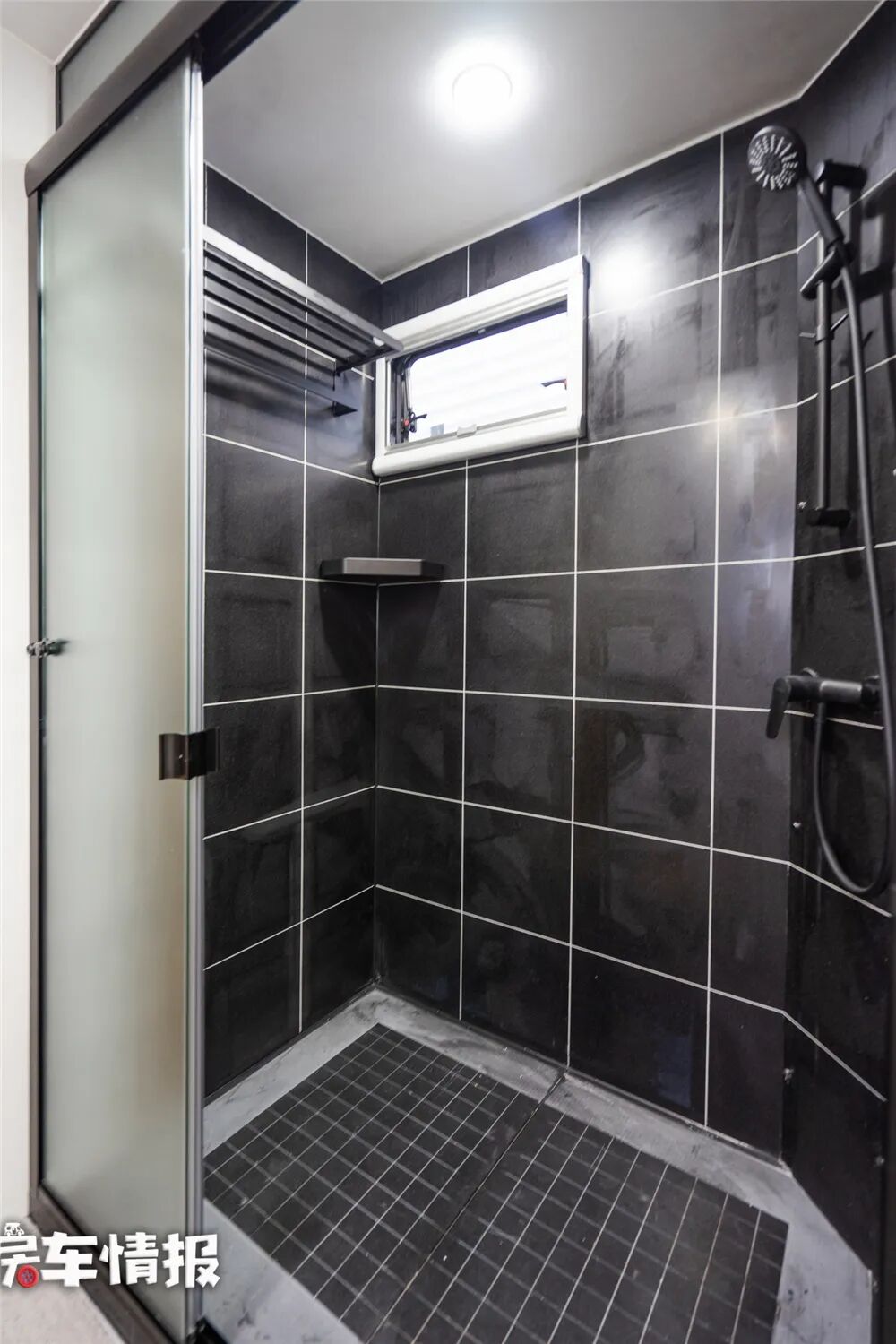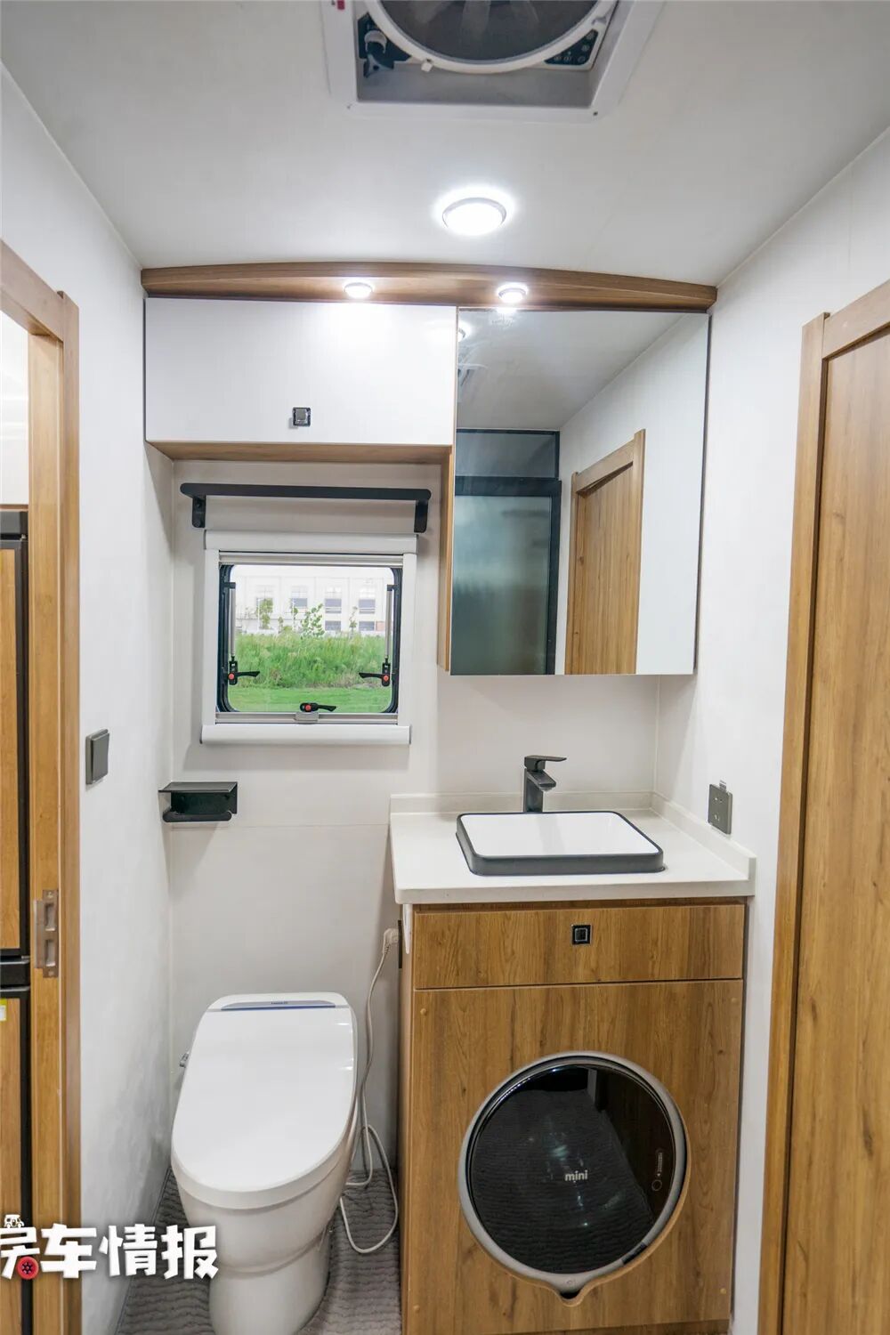 独立卫生间和主卧在一个方向,这样的布局方式也是很多豪华车上惯用的,更方便日常的起居生活。独立卫生间内部除了常规的盒式马桶、梳妆镜以外,还提供了一个独立的淋浴间,内部尺寸也是相当的大,日常洗漱也是非常轻松。