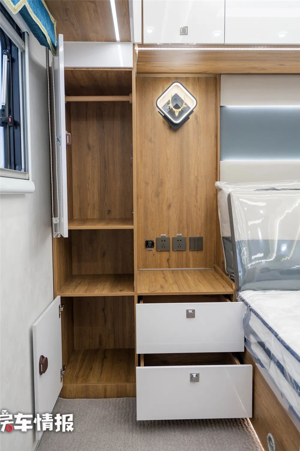 来到车尾部则是主卧区所在的位置,内部空间依然十分可观,提供了一张全尺寸的双人床,基本上和一般家里的次卧或客房相当,旅行中睡在这里肯定会特别舒服!