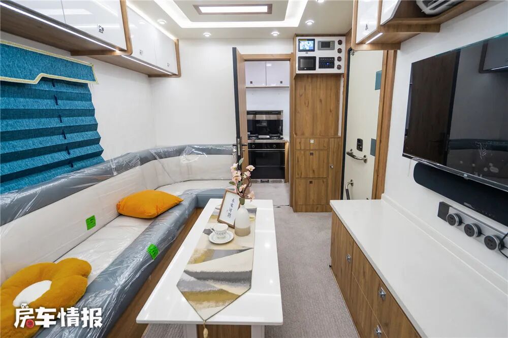 车内会客厅基本上和普通家里的布局完全一致,超大的沙发休息区,宽敞舒适,驻车以后躺在这里喝茶聊天都没问题,搭配上前方的条形茶几,以及前方的电视,这才是家里的样子!