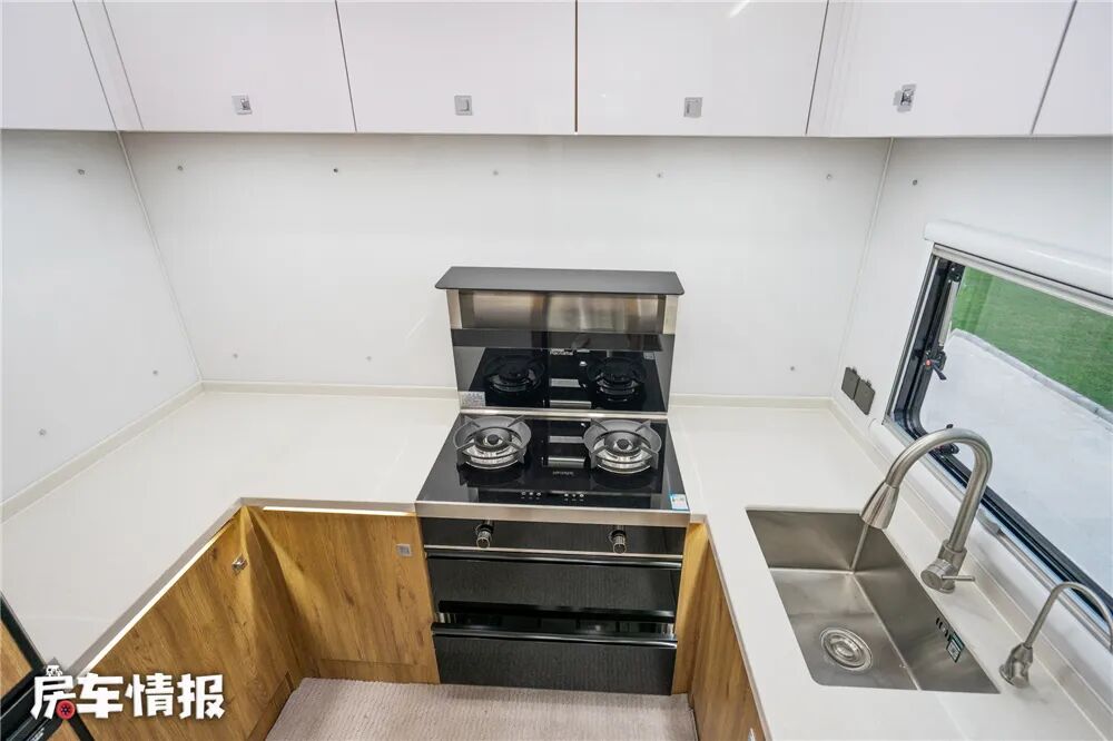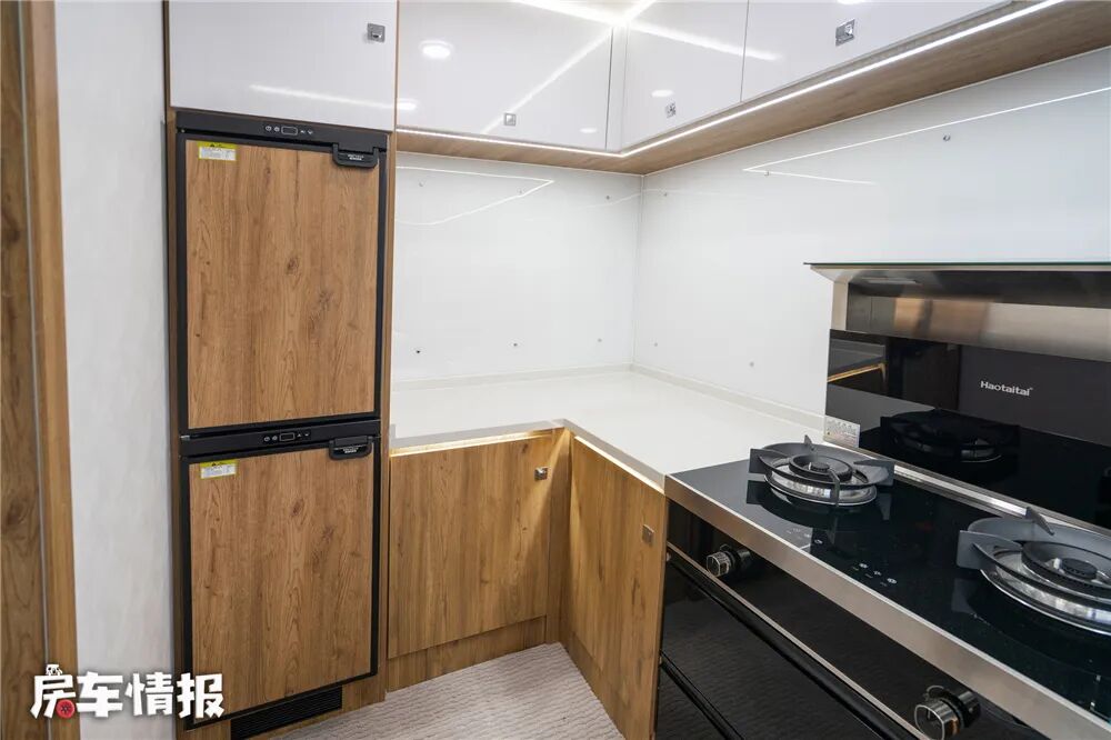 电视旁还专门提供了一台双开门房车专用冰箱,平时可以把零食或者饮料放在里边,日常拿取都比较方便;除此以外,这款车在厨房里还单独布置了一台双开门冰箱,用来储存食物或,这样的设计既干净又特能装。