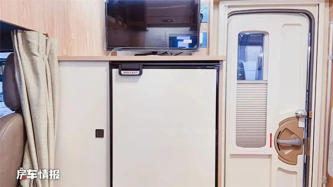 而在乘客门前方则提供了80L的单开门带有冷冻空间的车载冰箱和一台24寸的电视机,以满足平时居住的需求。
