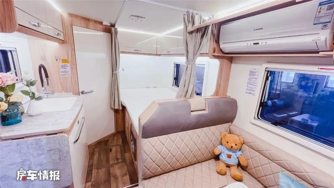 进入车厢内部,整体的氛围非常温馨素雅,加上能够变为单人床的L型沙发,车内总共配置了三张床铺,一张位于最前方额头区域内的额头双人床,另外一张则是尾部纵置设计的双人尾床,最多能够满足四大两小的睡眠需求。L型的会客沙发配有两条安全带,加上主副驾驶座椅,日常行车状态下,能够乘坐四个人,另外会客区顶部还配置了一台家用变频空调,能够根据需求调节车内的温度。