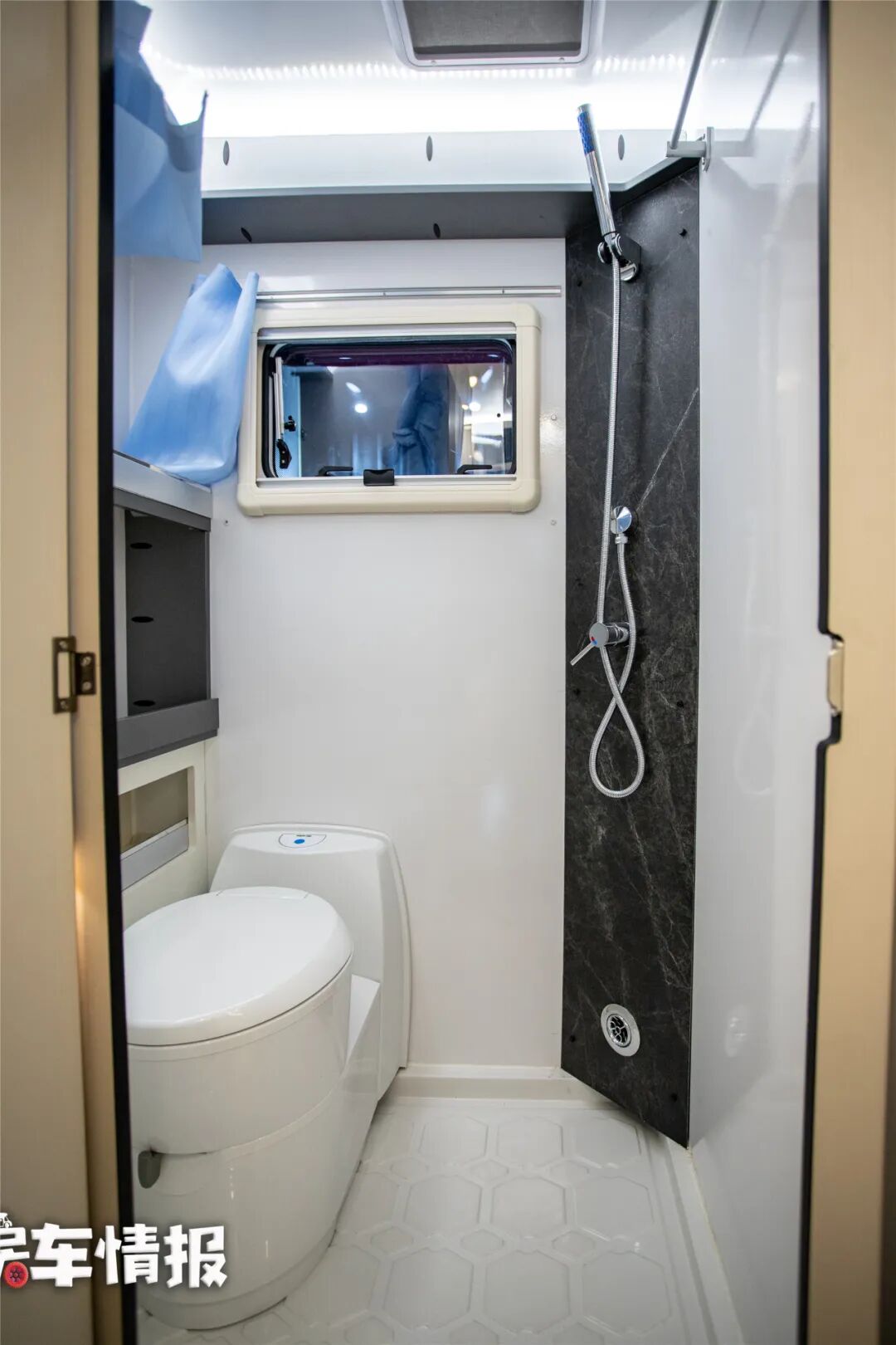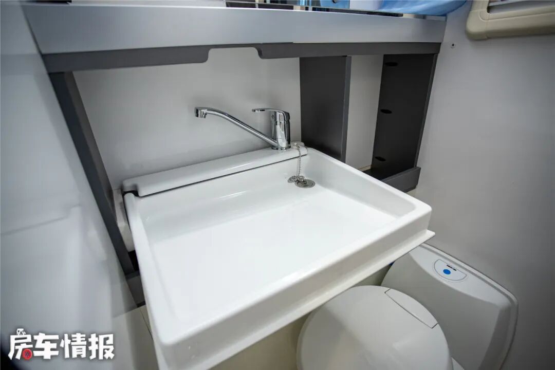 卫生间内部空间真心挺大的,成年人在车内可以自由转身,完全不会感到憋屈,卫生间内部提供了盒式马桶、独立淋浴花洒、换气扇、隐藏式洗手池,日常洗漱都没有问题。