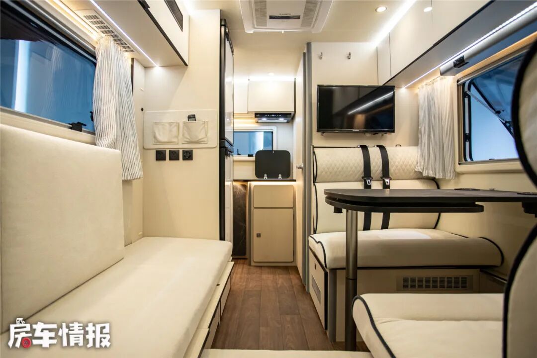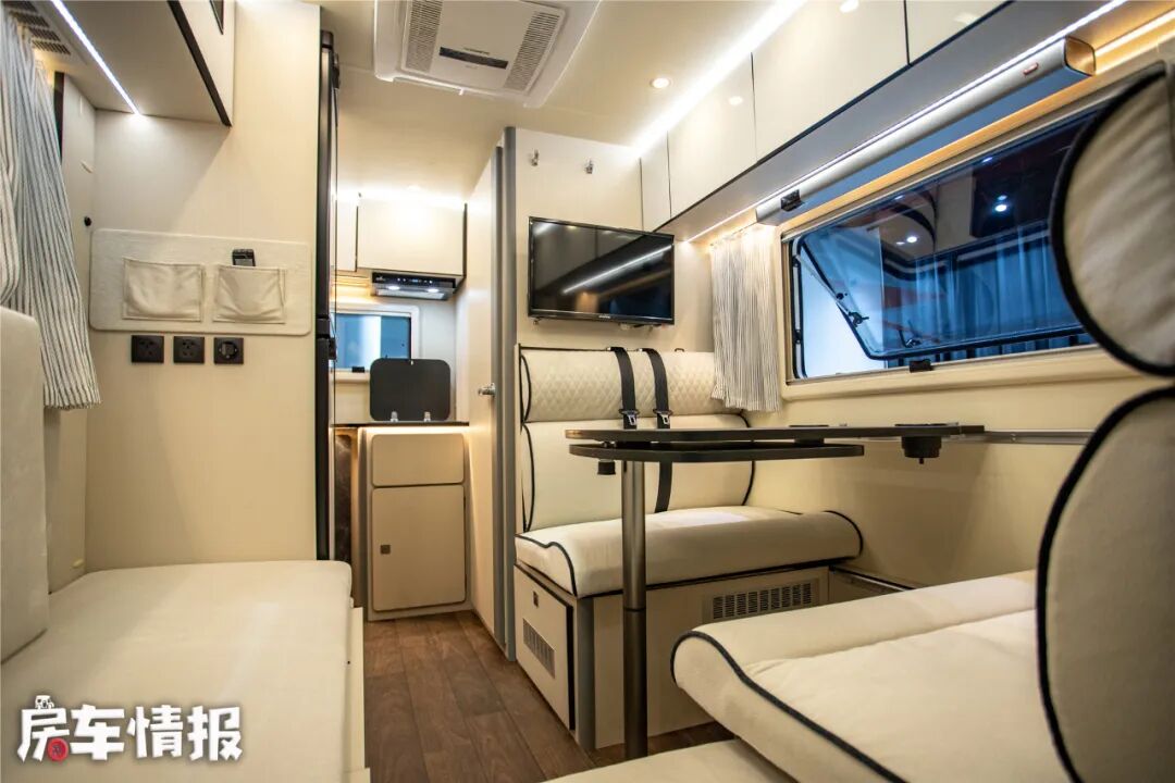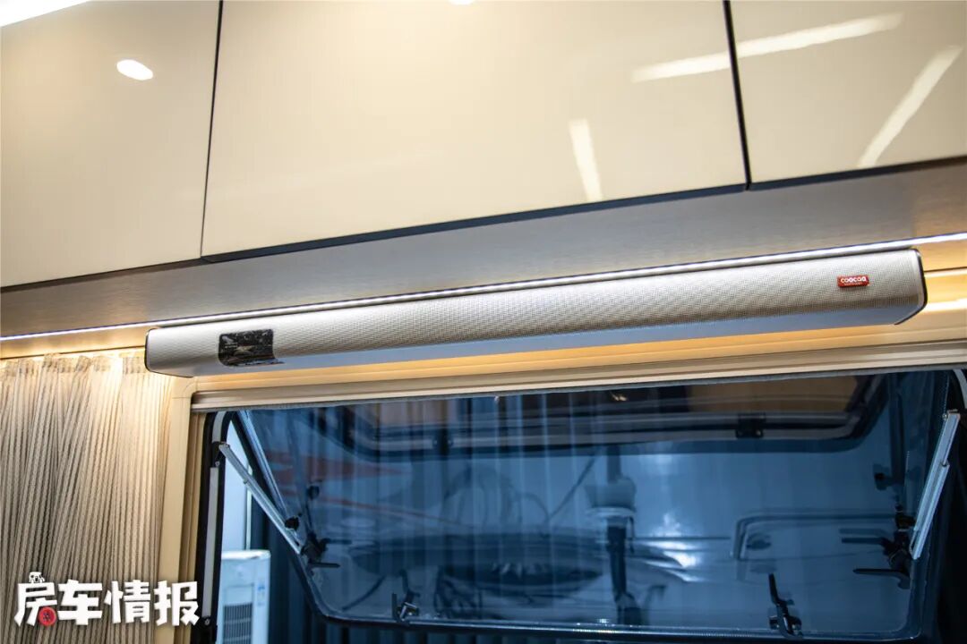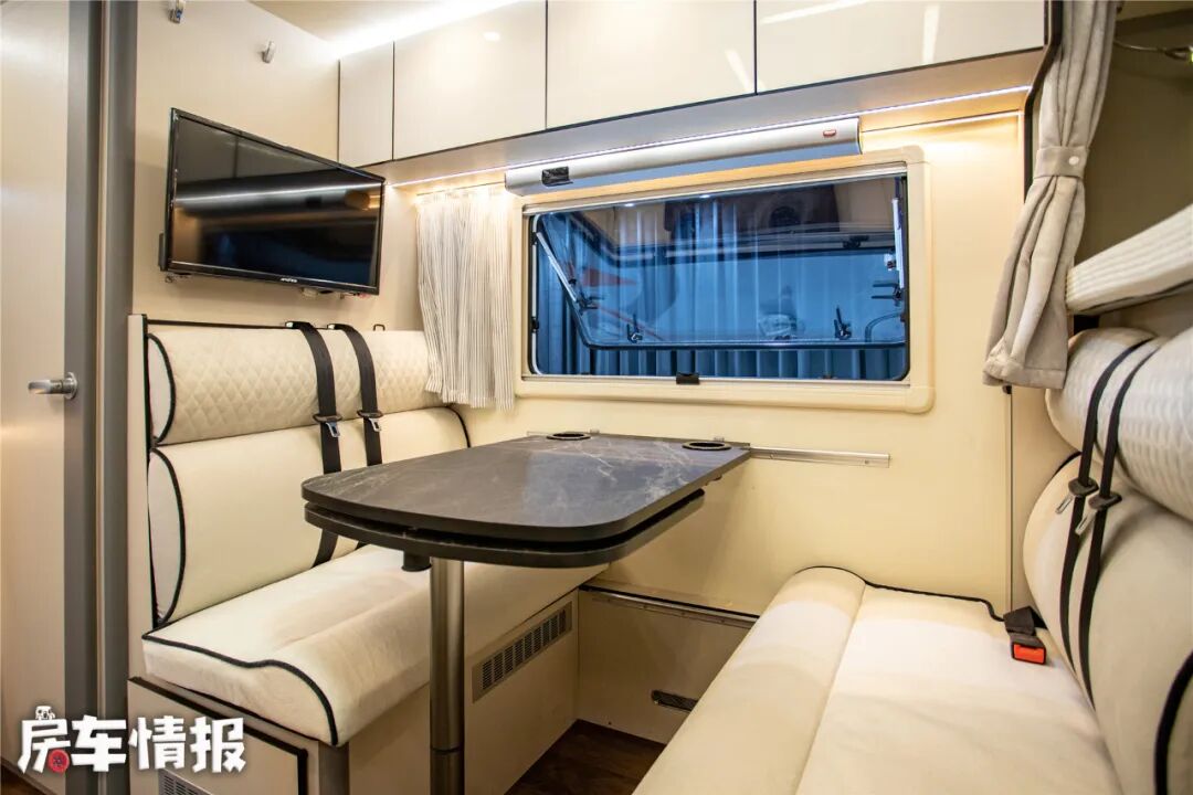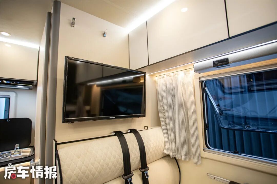 位于对卡座上方提供了一台24英寸液晶电视以及一个回音壁,可以在旅行中观看电视节目,如果喜欢看电影的话,建议后期加装一部投影幕布。