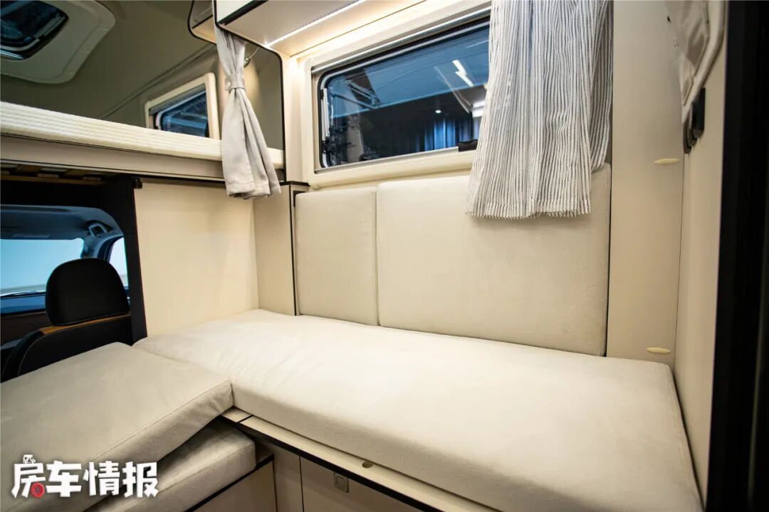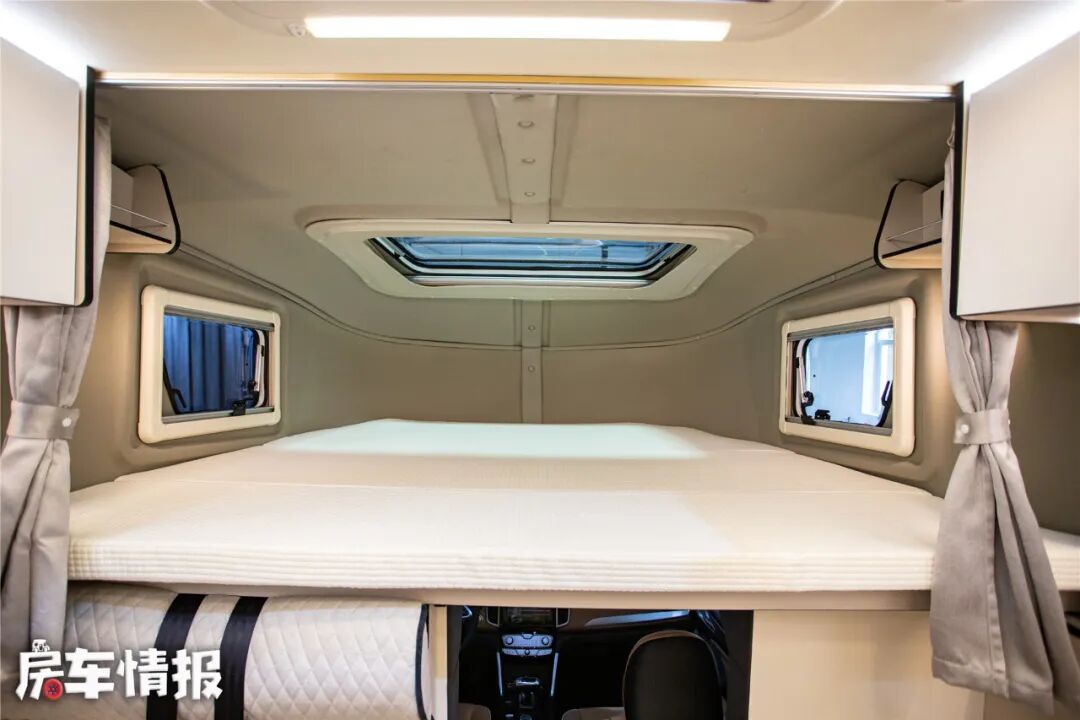 到了夜晚的时候,车内提供了两张大尺寸双人床,第一张就是位于驾驶室上方的额头床,尺寸达到了1米9*1米76,睡下两个成年人非常轻松,再加上一个小朋友也没问题,三面换床,通透性也很不错;