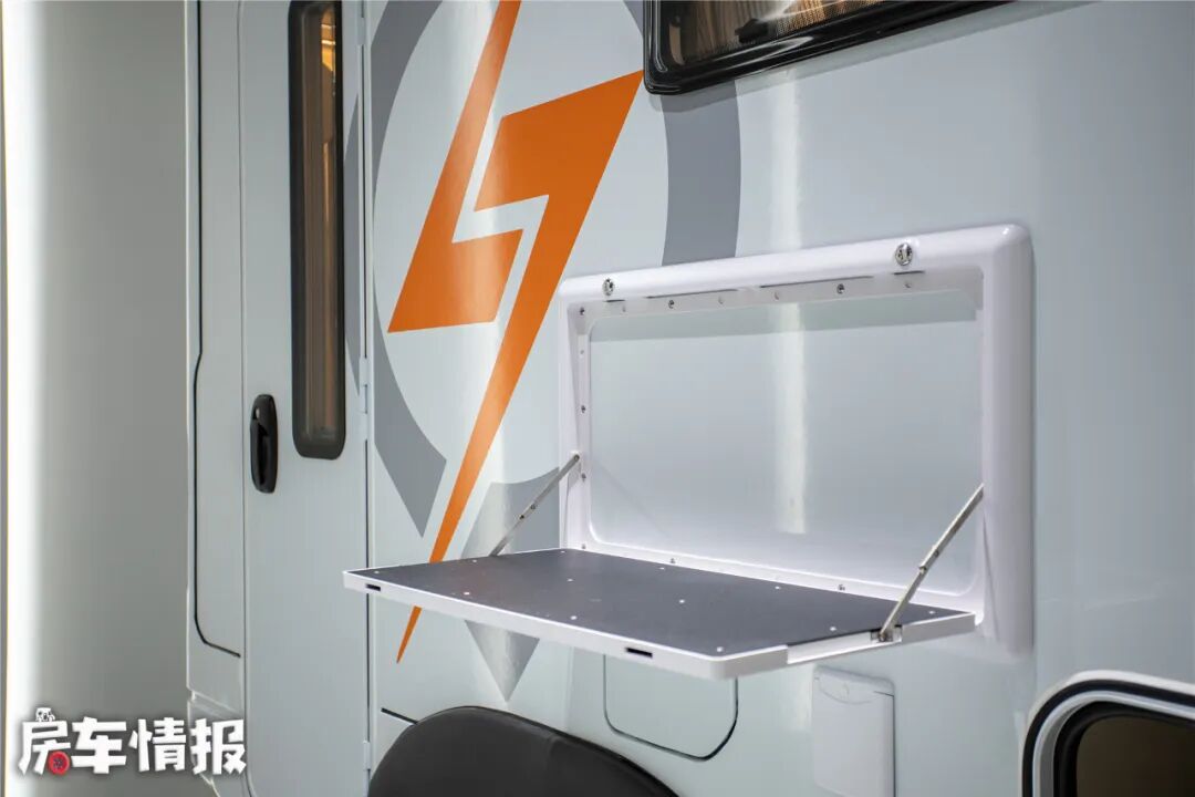 除此以外,车身左侧还加入了一个新能源充电口,虽然不具备快充功能,但也提高了旅行中的充电效率,另外这款车自身还带有560Ah的长城蜂巢锂电池和300W太阳能电池,差不多有7度电,基本上能够满足2-3天的使用。