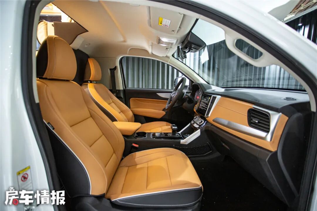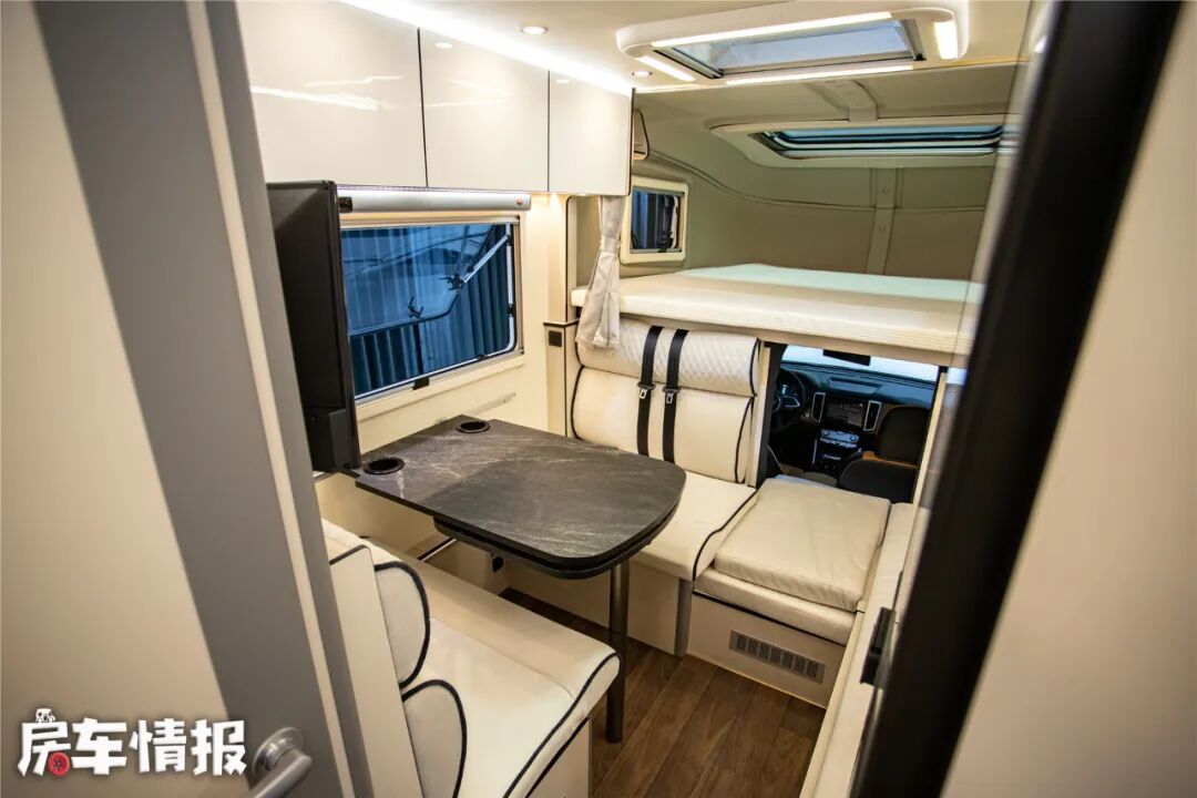 第二张床就是对卡座+条形沙发拼成的沙发床,尺寸达到了1米9*1米4,睡下两大一小也没问题,如此一来,这款皮卡房车真的是做到了6座6卧。