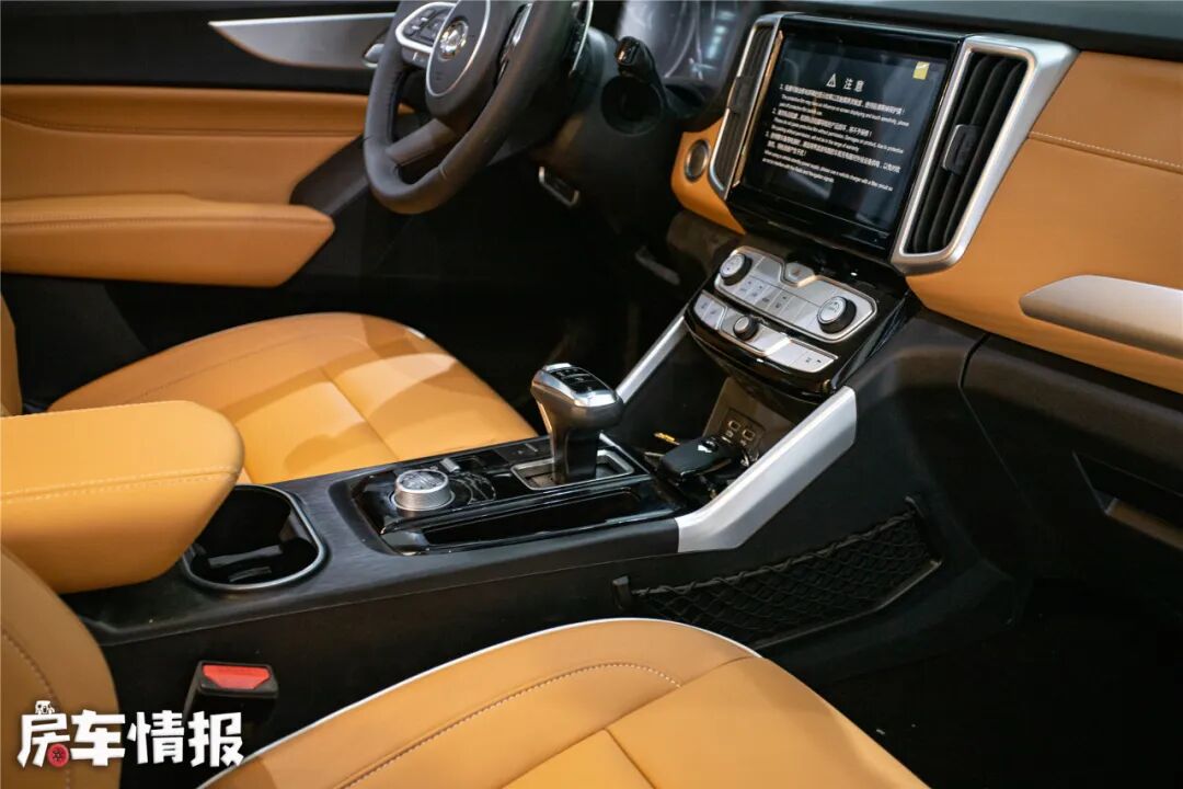 驾驶室内部的设计也是延续了长城炮的整体风格,实拍车型在采用了马鞍棕的内饰配色,提升了整个驾驶室的豪华感,电子挡杆、主驾驶电动调节、右前盲区监测等配置也在一定程度上提升了驾驶的便利性和舒适性。