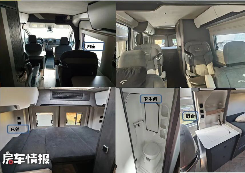 整车的内部和我们日常所看到的B型房车不太一样,采用了前后分区的设计,前方为会客休息区域,匹配的是航空级座椅,设计的很有商务车的感觉,无论是日常的会客洽谈,还是临时的小憩调整,都能过满足;而后方则是打造成了厨卫一体区,配置也相对齐全,对于一些基本的生活需求,还是能够满足的。