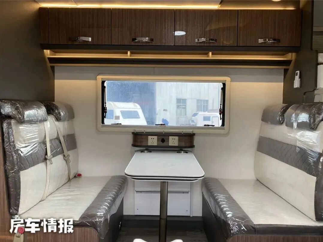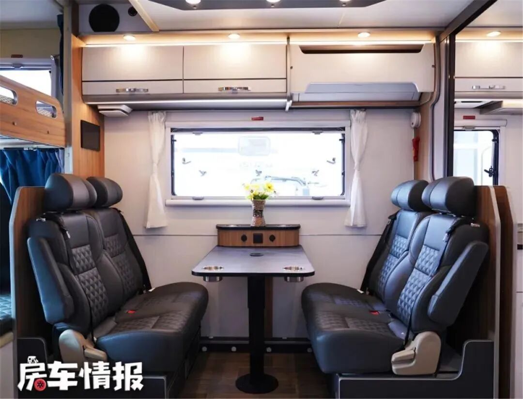 与之相对的一侧则是经典的四人对卡座沙发+升降餐桌组成的就餐区域,配有四条安全带,加上主副驾驶座椅,全车最多可以核载6个人,而且座椅全部采用了乘用车级别的设计,可以调节靠背角度,以达到一个比较舒适的坐姿,另外在顶部也提供了基础的吊柜和一台家用变频空调。