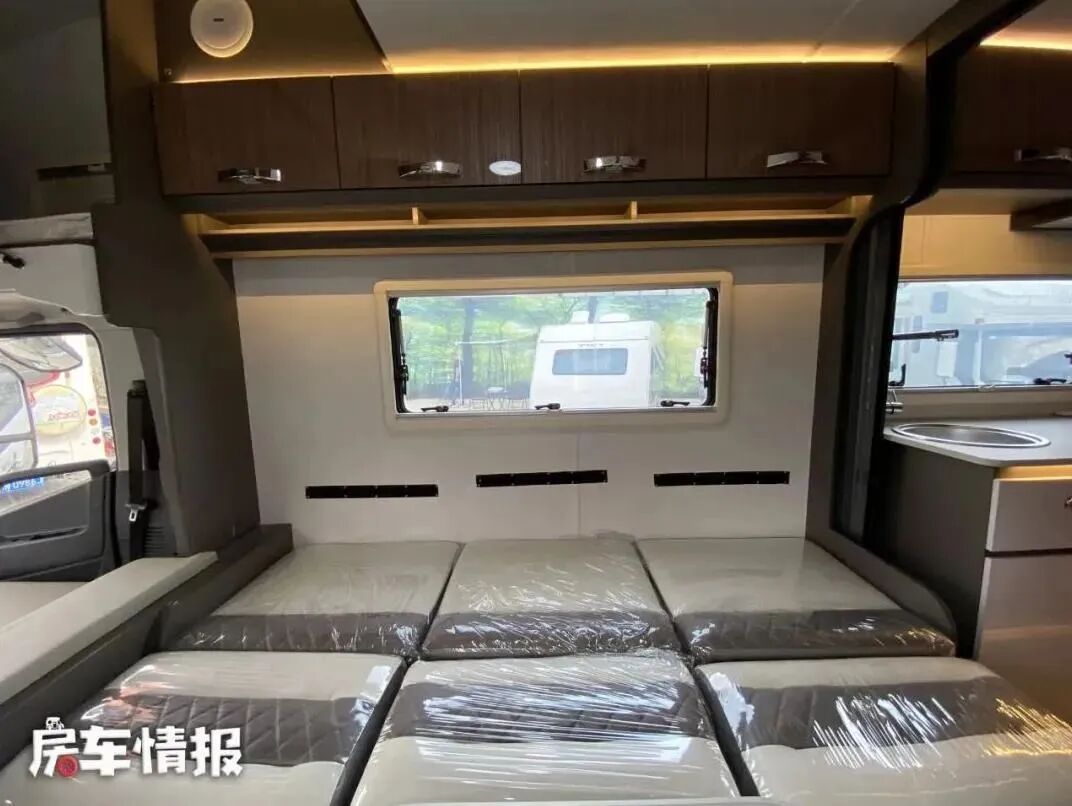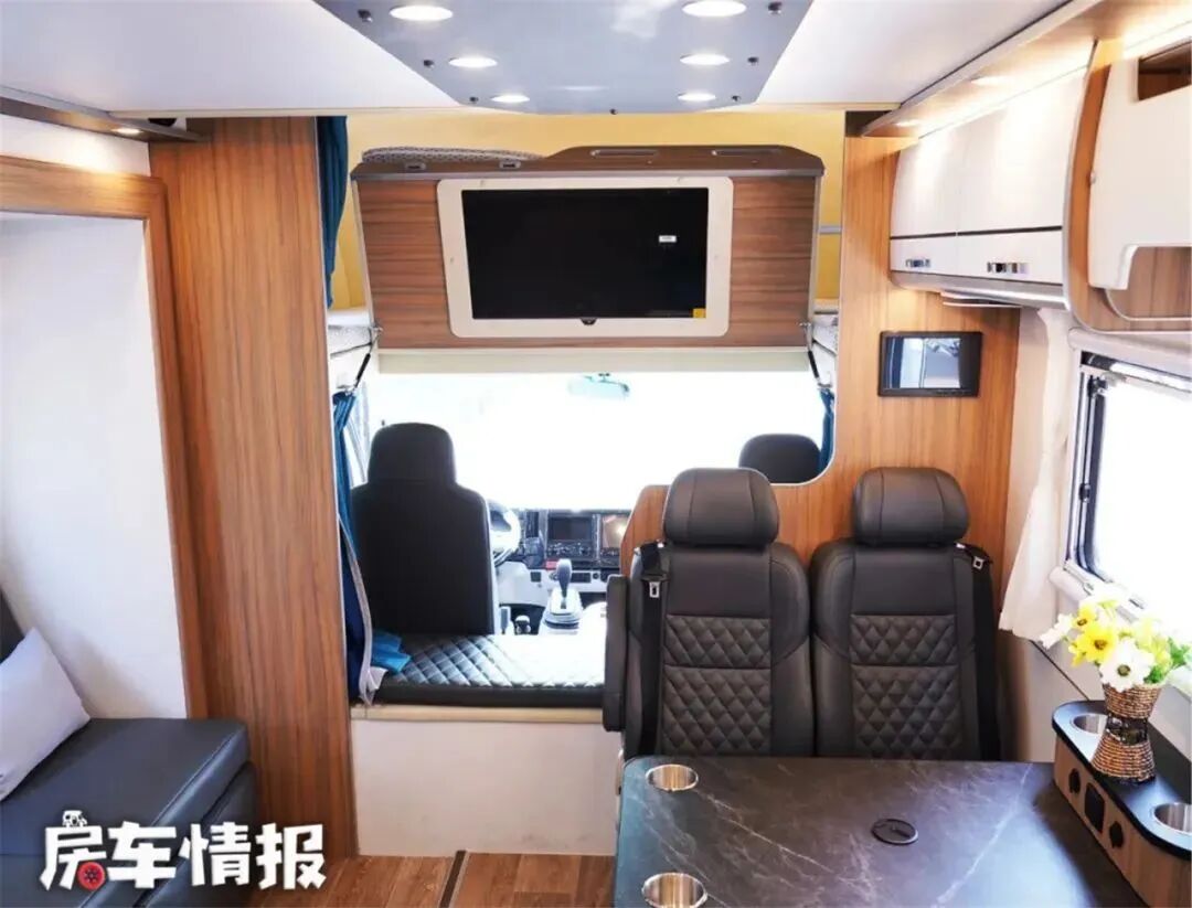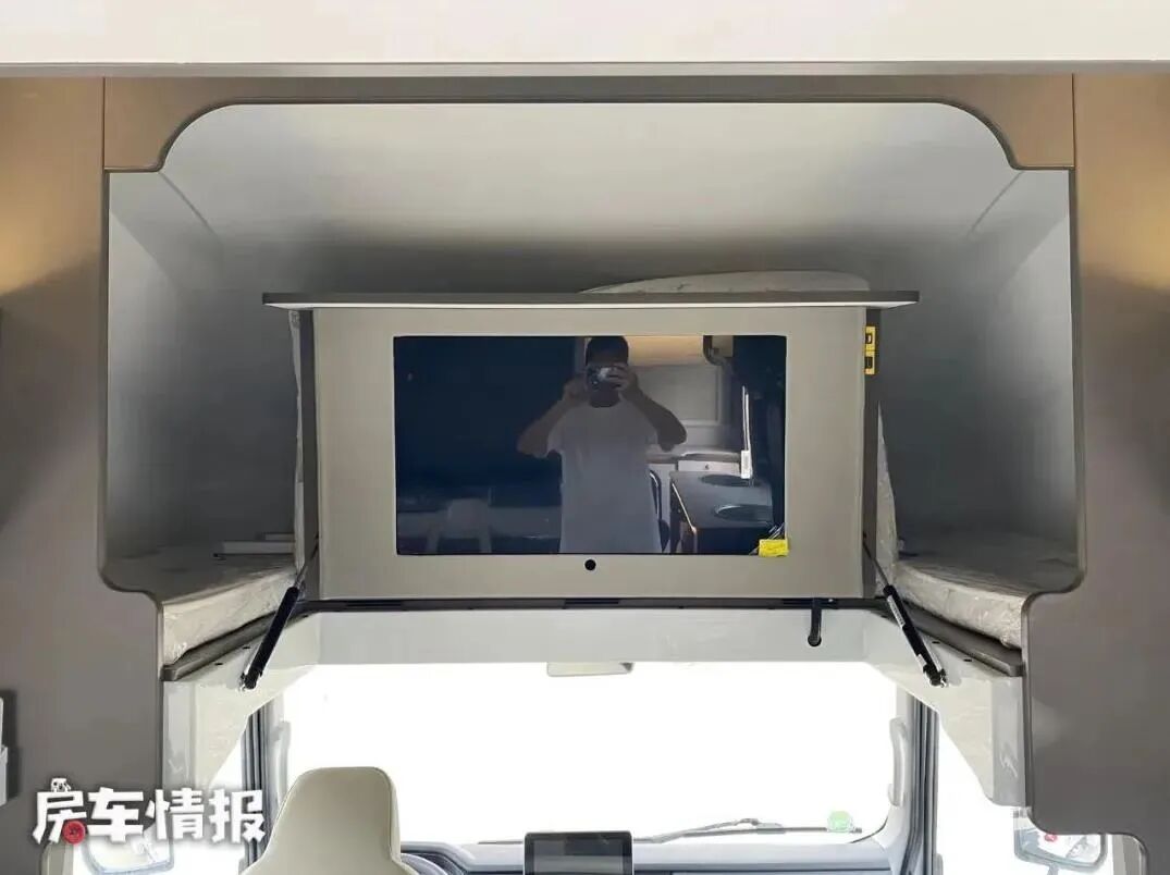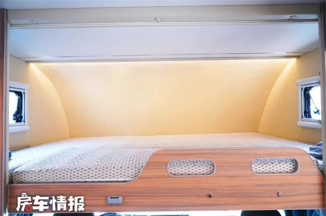 最前方驾驶室顶部是固定的睡卧区,提供一张可以容纳两个人睡觉的双人床,床板下方还配置了一台32寸的液晶电视,这样在驻车休息的时候就可以看看电视追追剧了。