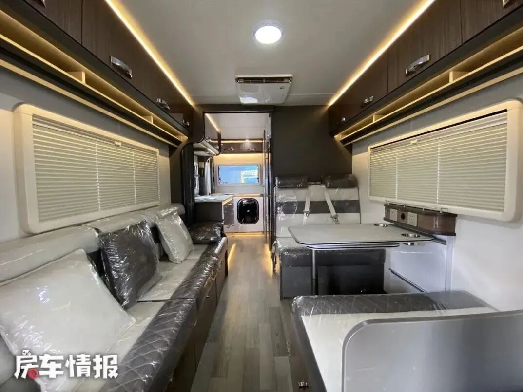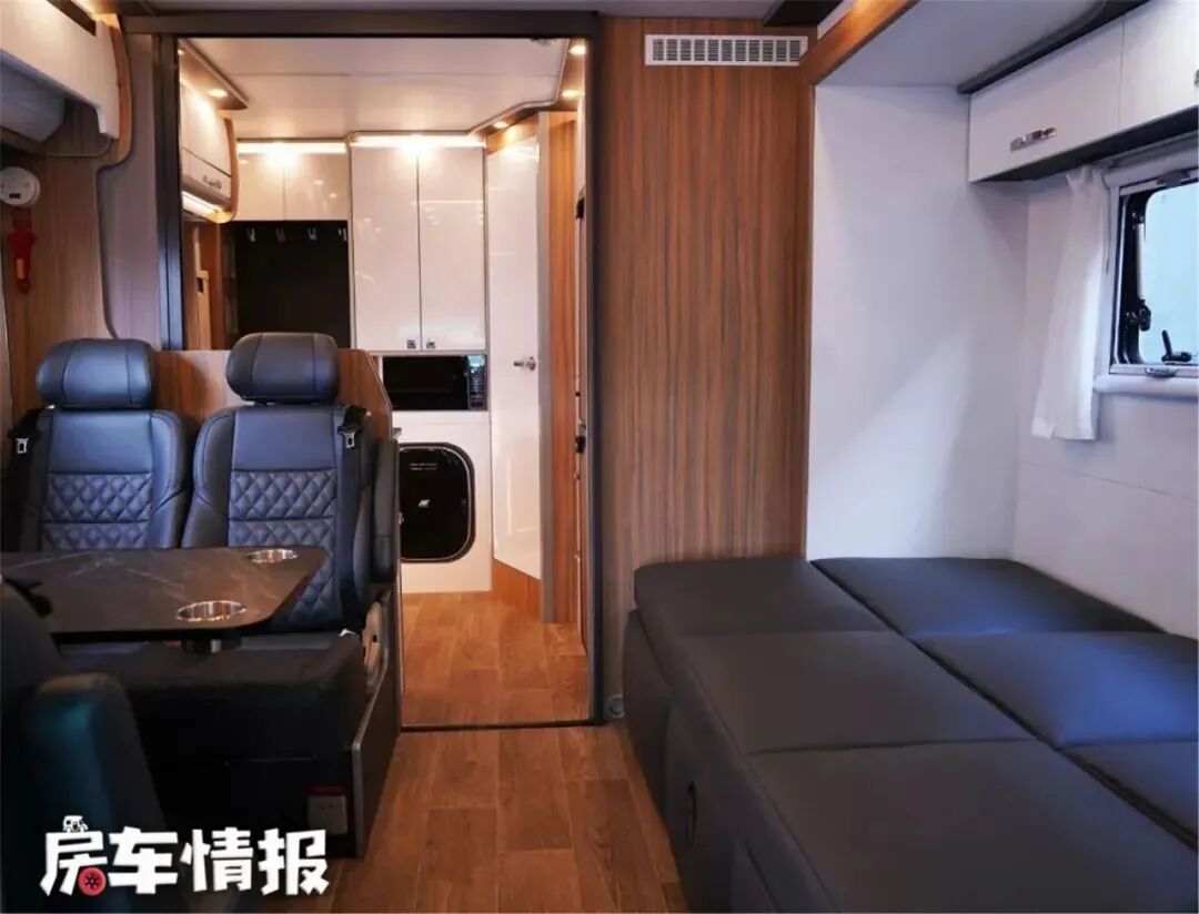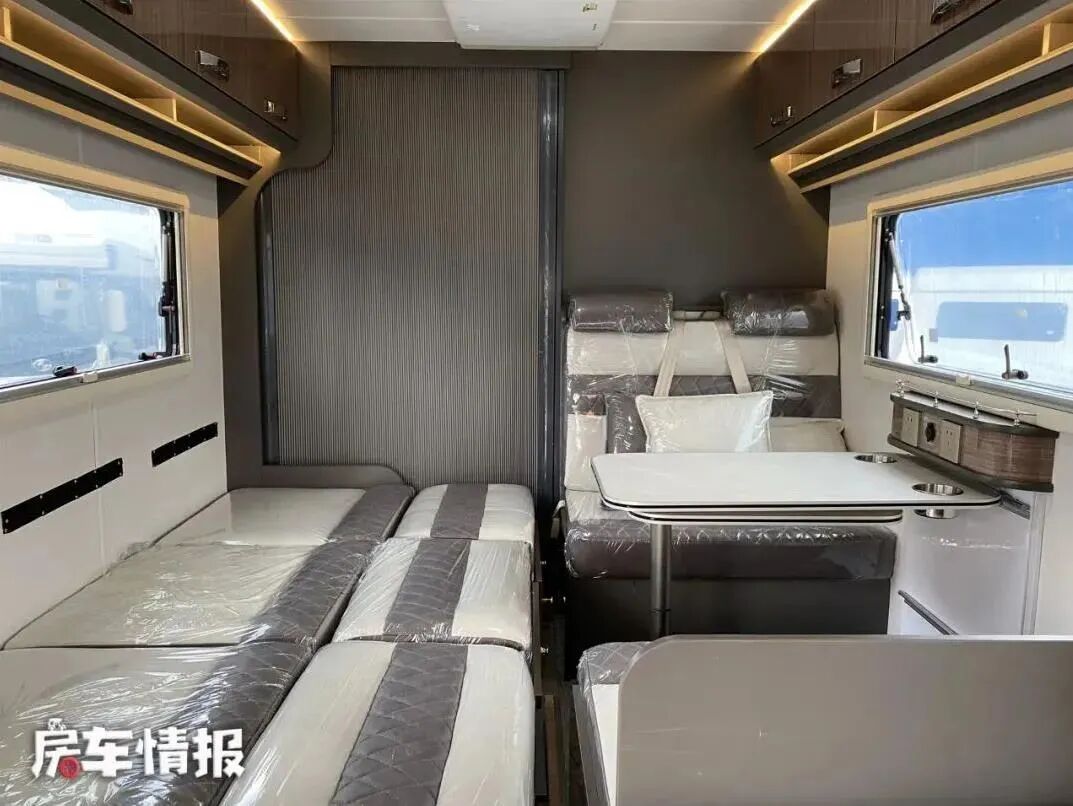 得益于底盘的尺寸,车内的空间表现非常不错,另外还有拓展舱的加持,即便是 一家人在车内居住也完全能够容纳,而整体的布局则是采用了经典的单拓展车型布局。