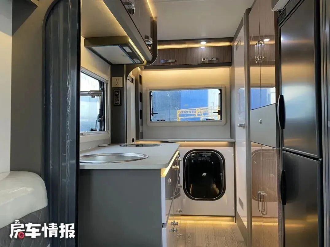 这款车同样采用了后置厨卫区的设计,文章开头我们也说到了这款车是带有一个独立的厨房,和美景美家的卡居二号一样,这款车在前方生活区和后方厨卫区中间设计了一扇推拉门,这样就能很好的将两个空间相互隔开。