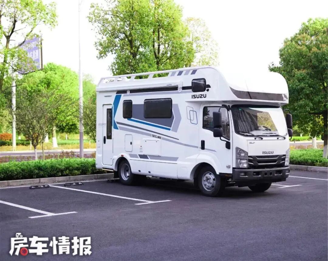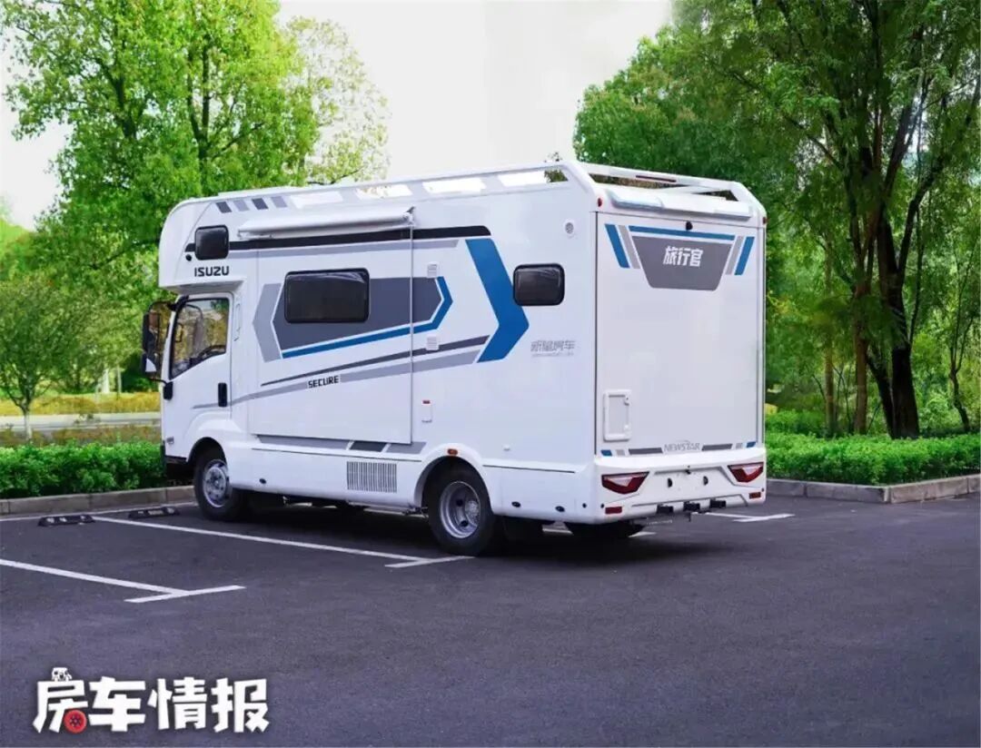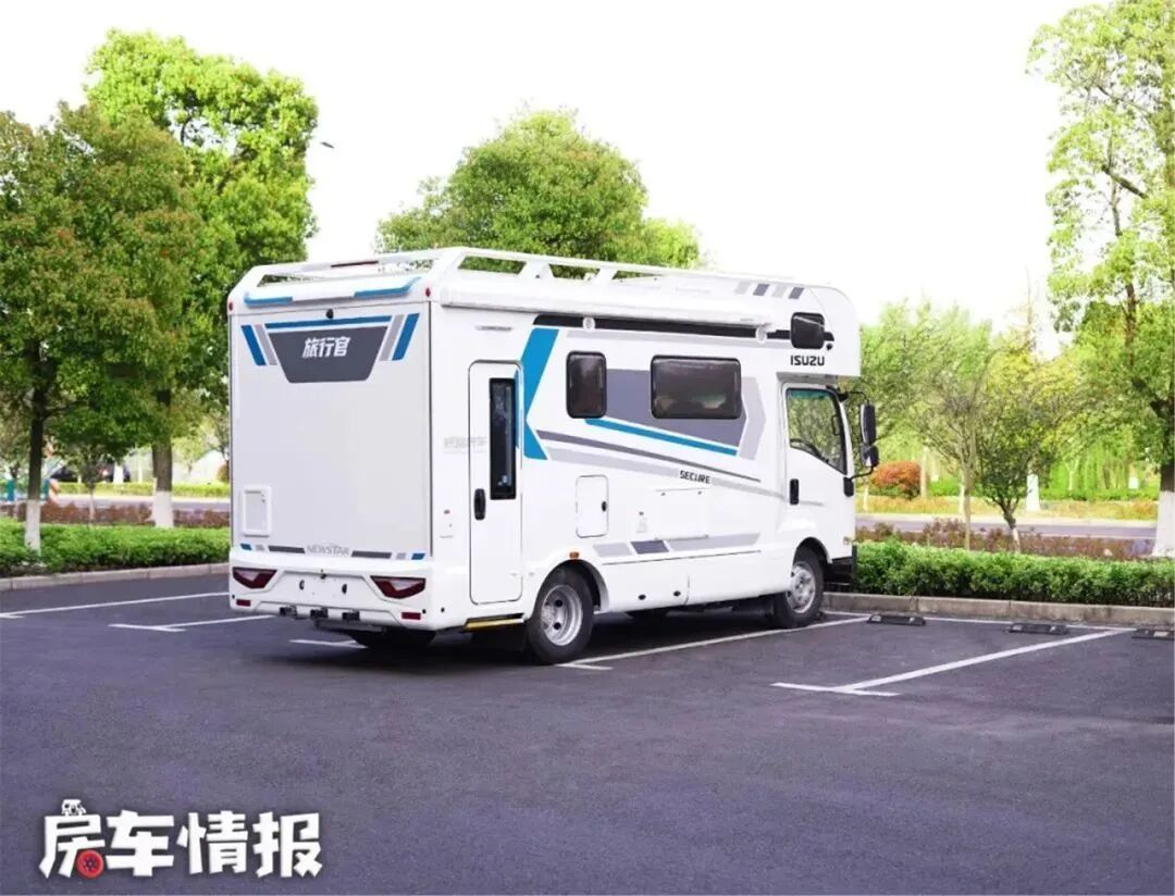 第二款就是来自于新星房车推出的基于五十铃700P底盘所打造的旅行官房车,不过严格的讲,从底盘分类上这款车其实是属于中卡房车的,即便如此,整辆车依旧保持在蓝牌C本可驾驶的规定范围之内,长宽高分别为5990*2300*3180毫米,整车左侧带有拓展舱,采用后入门的上车方式。