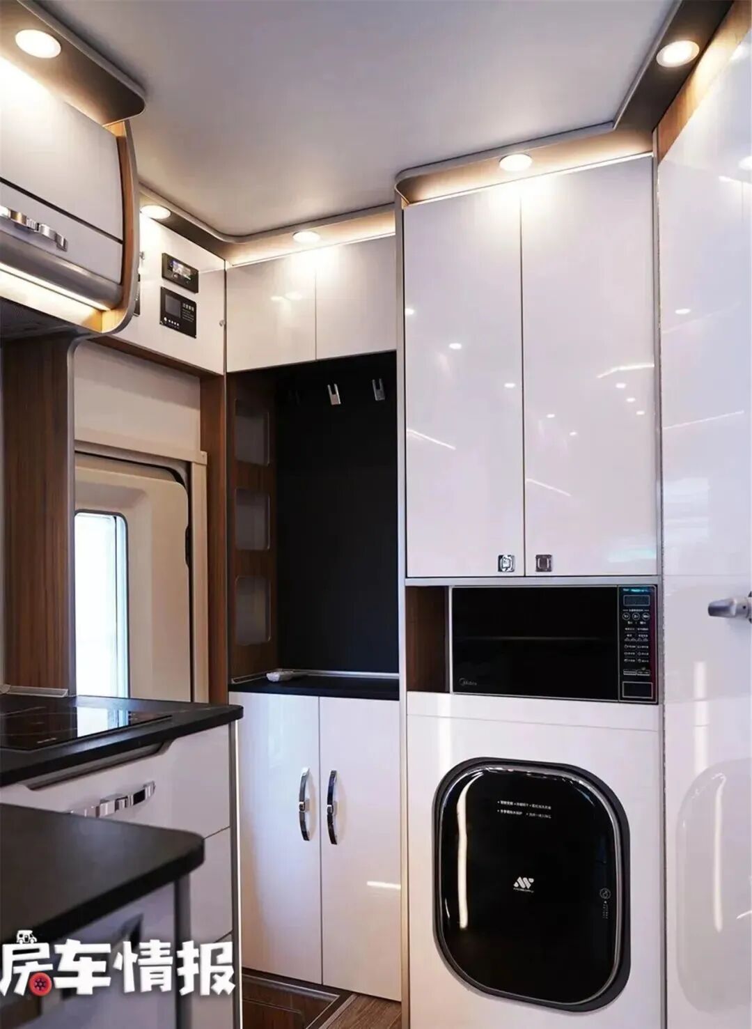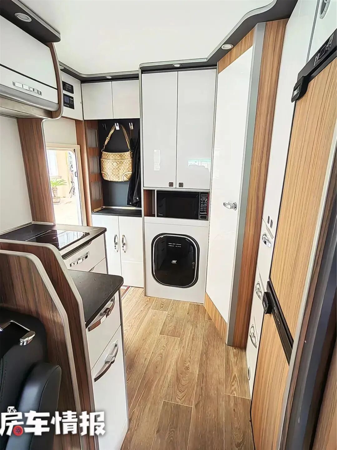 而外侧靠近乘客门处则是提供了基础的储物空间,以及一台小型的洗衣机,可以满足日常清洗贴身衣物的需求。