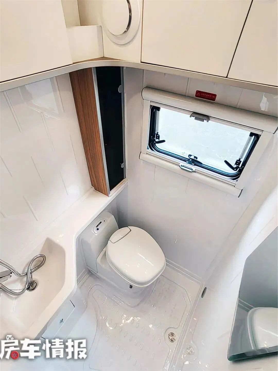 车厢尾部内侧则是全车的独立卫浴室,内部提供了可旋转的盒式马桶、独立的淋浴花洒和洗手台盆,能够解决日常生活所需。