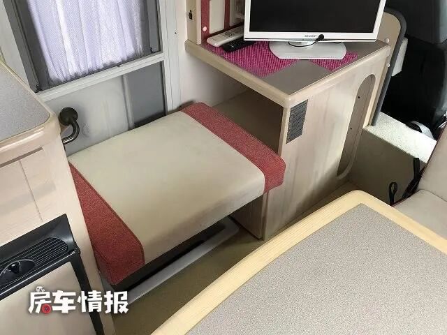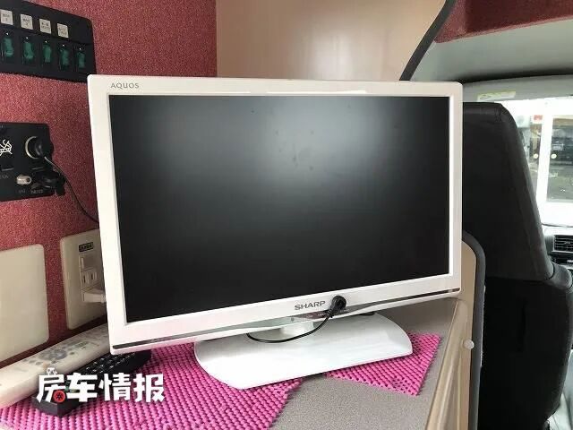 乘客门前方的小区域被打造成了电视柜,下方的储物抽屉可以放拖鞋,台面上方则提供了一台立式电视机。