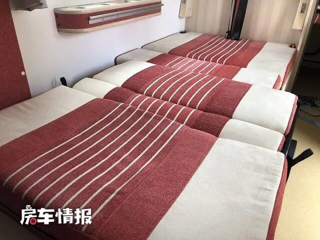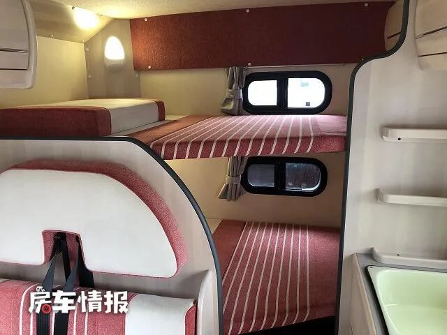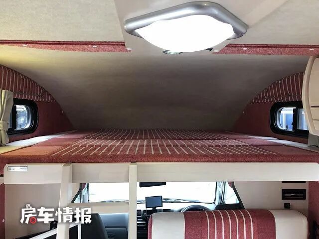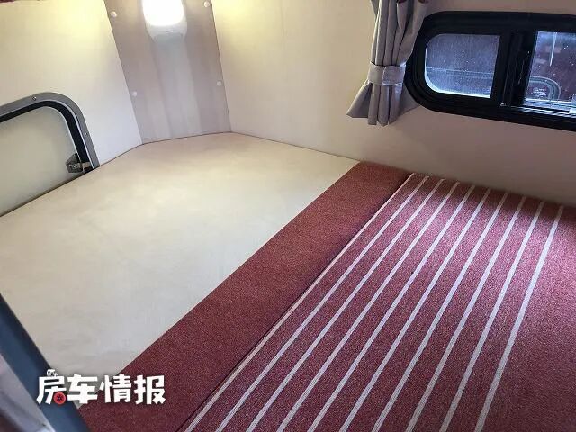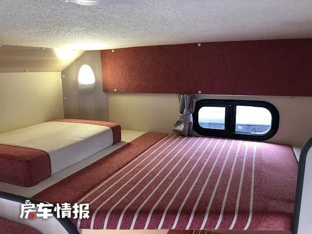 除去尾床和沙发床之外,在前方驾驶室上方的额头区域内还有一张双人额头床,平时也可以容纳两个成年人休息睡觉使用。所以整车最多可以容纳五个成年人休息。额头两侧都装有窗户,既增加了采光也可实现空气对流。