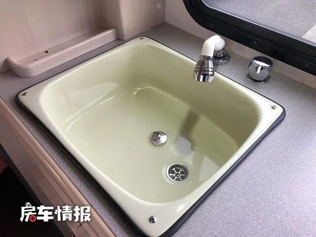 乘客门后方是厨房操作台,功能配置比较单一。台面上提供了洗菜池,下方则提供了一个小型的车载冰箱,后期也可加装便携式的燃气灶或电磁炉,满足开火做饭的需求。