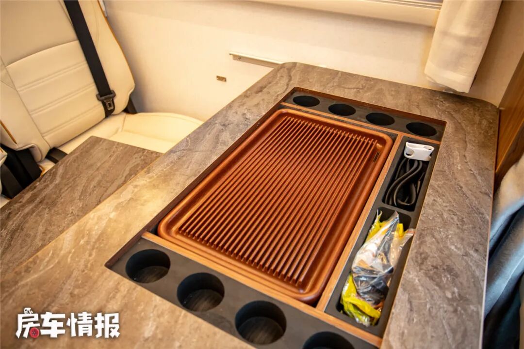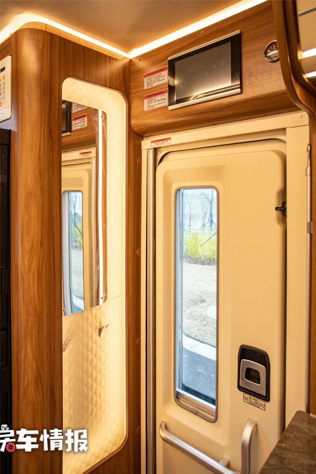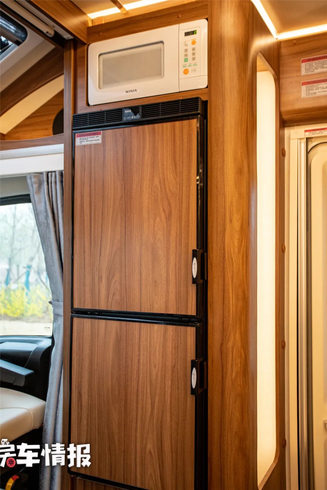 而全车的148L双开门冰箱和微波炉则是位于乘客门前方,这样在会客区就餐的时候,也能更好的拿取食物。