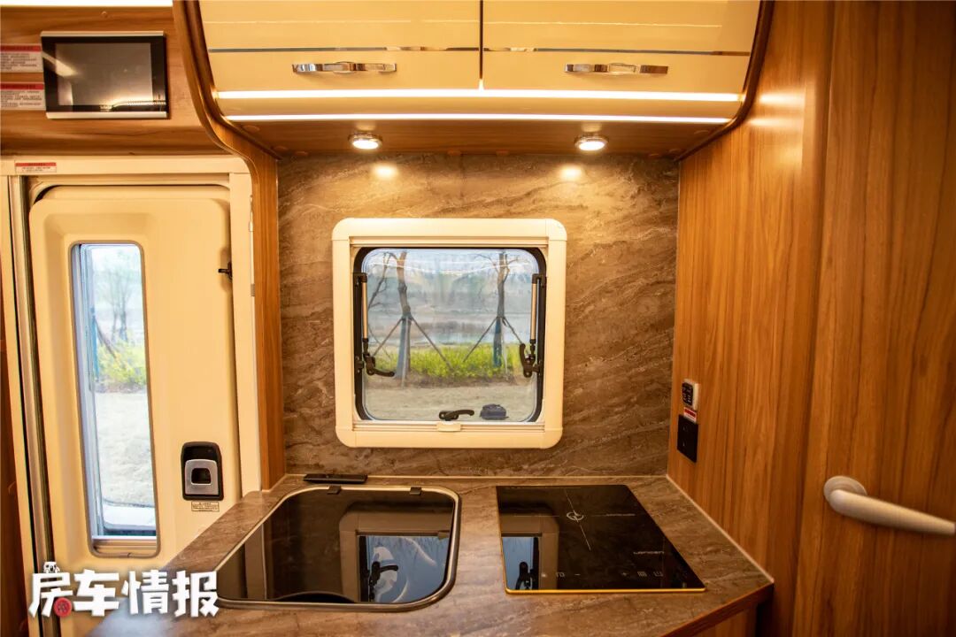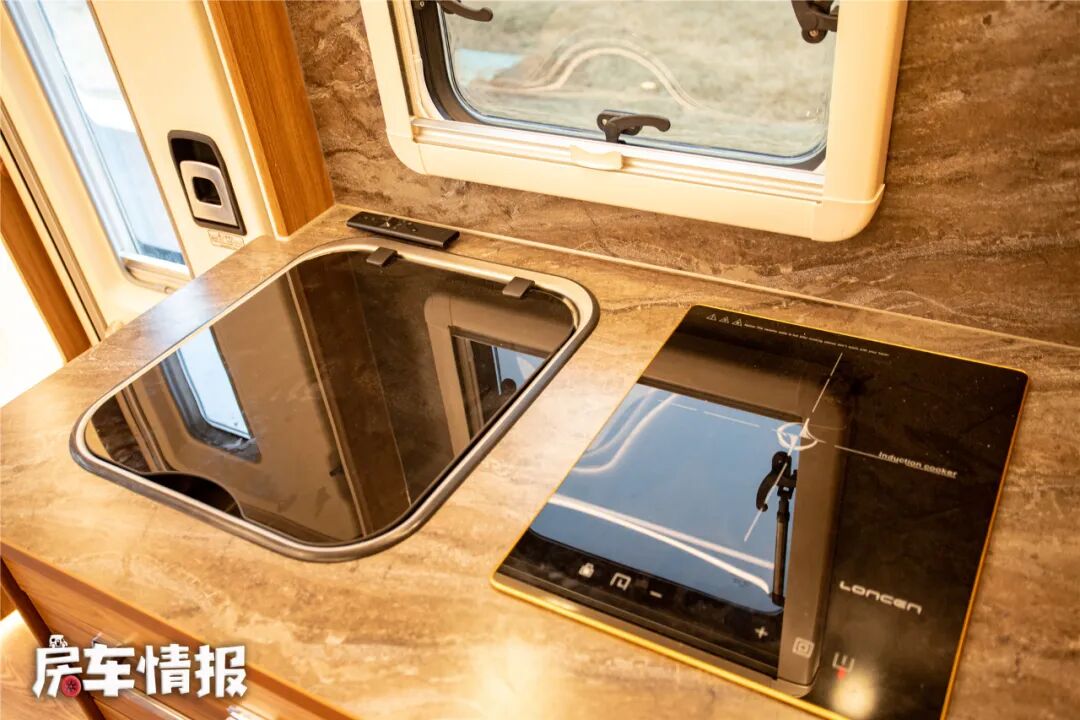 乘客门后方是全车的厨房区域,仿大理石的台面看起来非常高档,台面上也配置翻盖的水槽和朗宸特制的电磁炉,侧面还有能够拓展的备菜桌板,以满足日常所需。