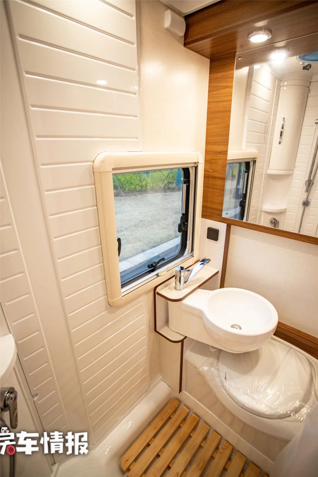 厨房区后方是一间独立卫浴室,内部采用了吸塑式的设计,可以有效的防水防潮,同时这款车内还采用了免胶安装的工艺,不仅环保而且更耐用,卫浴室内部的空间还是非常可观的,这要得益于可旋转的洗手台盆设计,另外还提供了固定式的马桶、独立的淋浴花洒、镜面储物柜、换气扇等,能够满足日常的洗漱需求。