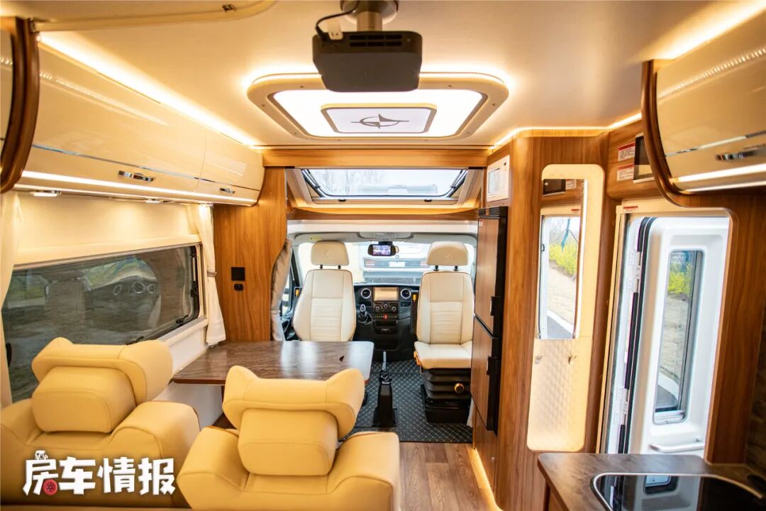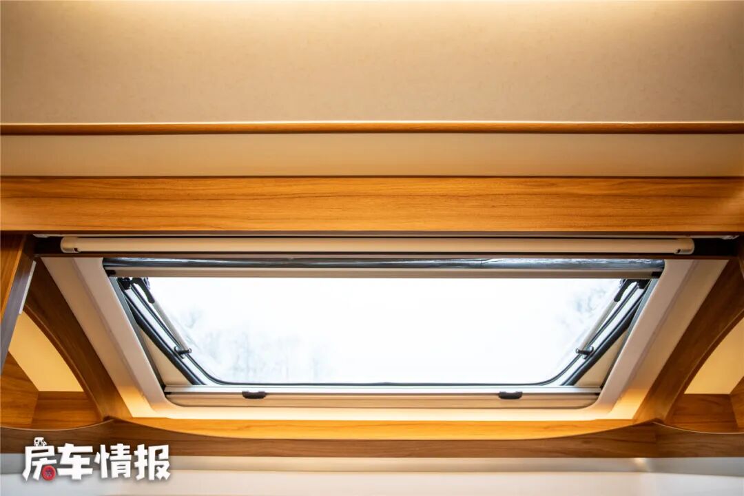 因为是采用了小顶式额头的设计,所以取消了常见的额头床,取而代之的一扇大尺寸的天窗,不仅增加了整体的通透性和采光度,也提升了全车的美观度。