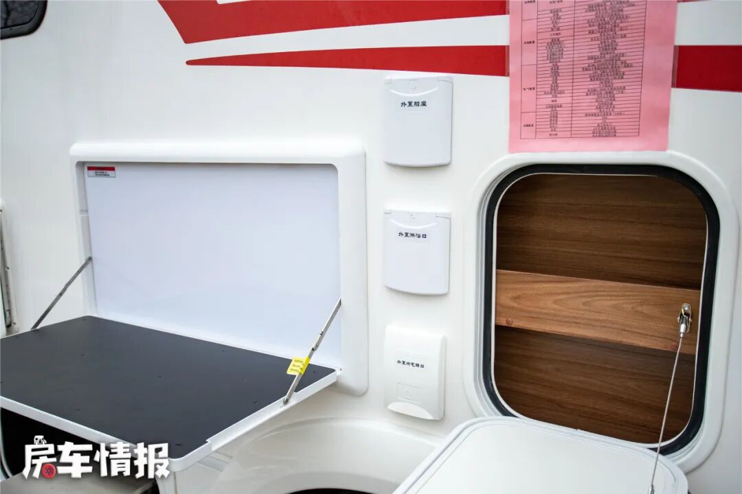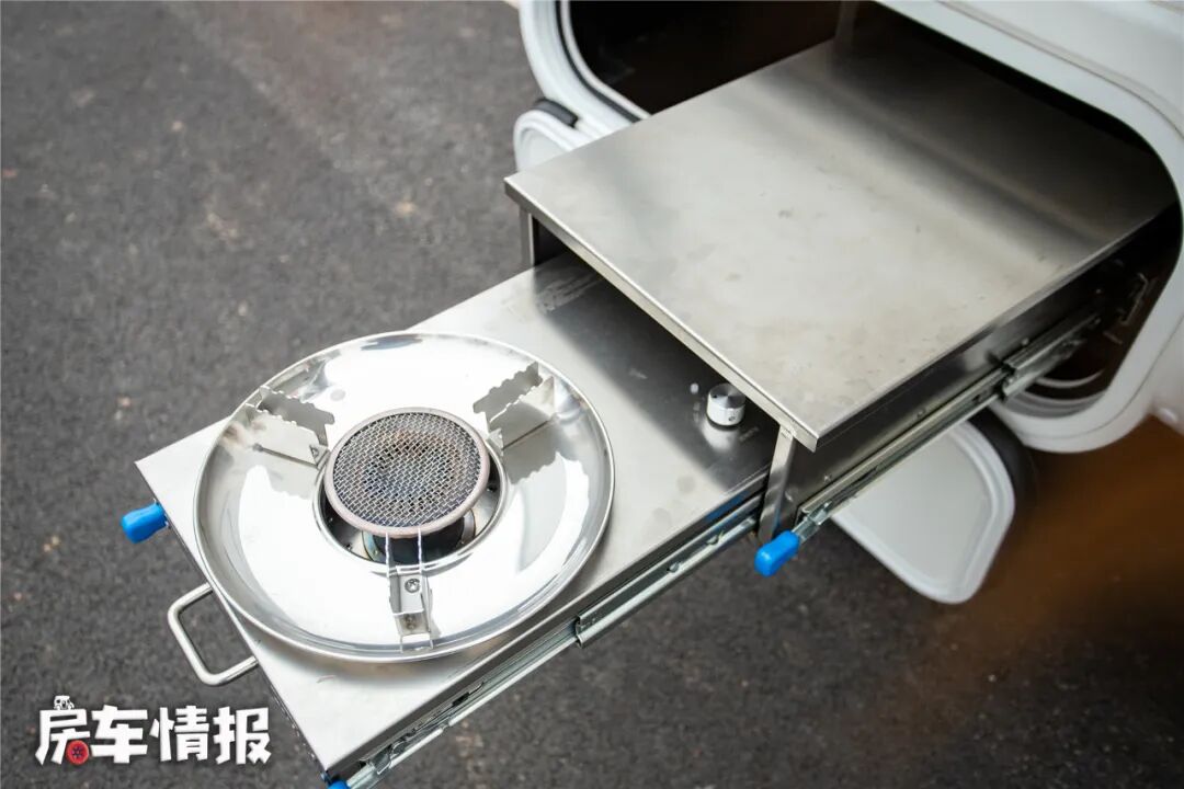 除了颜值较高的车身造型,车外的配置也很齐全,包括遮阳棚、外置的抽拉燃油灶、外置翻板、户外淋浴花洒、大尺寸的储物舱以及水电接驳口等,可以方便用户在后期能够在车外营造一个休息的区域。