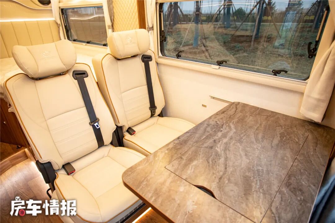 位于主驾驶座椅后方的是全车的会客区域,采用了双人连排座椅和大尺寸升降餐桌的设计,座椅是使用了乘用车级别的设计,所以能够按需调节角度,对于日后的乘坐提供了不错的舒适性。
