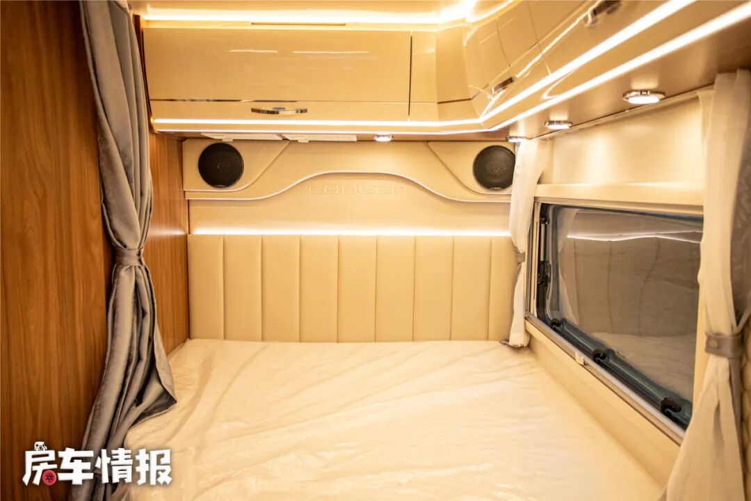 全车的主要休息区位于会客区的后方,是一张纵置的双人床,侧面带有拓展区域,拓展后床铺尺寸可达1900*1350毫米,也完全可以满足两个成年人的睡眠需求。