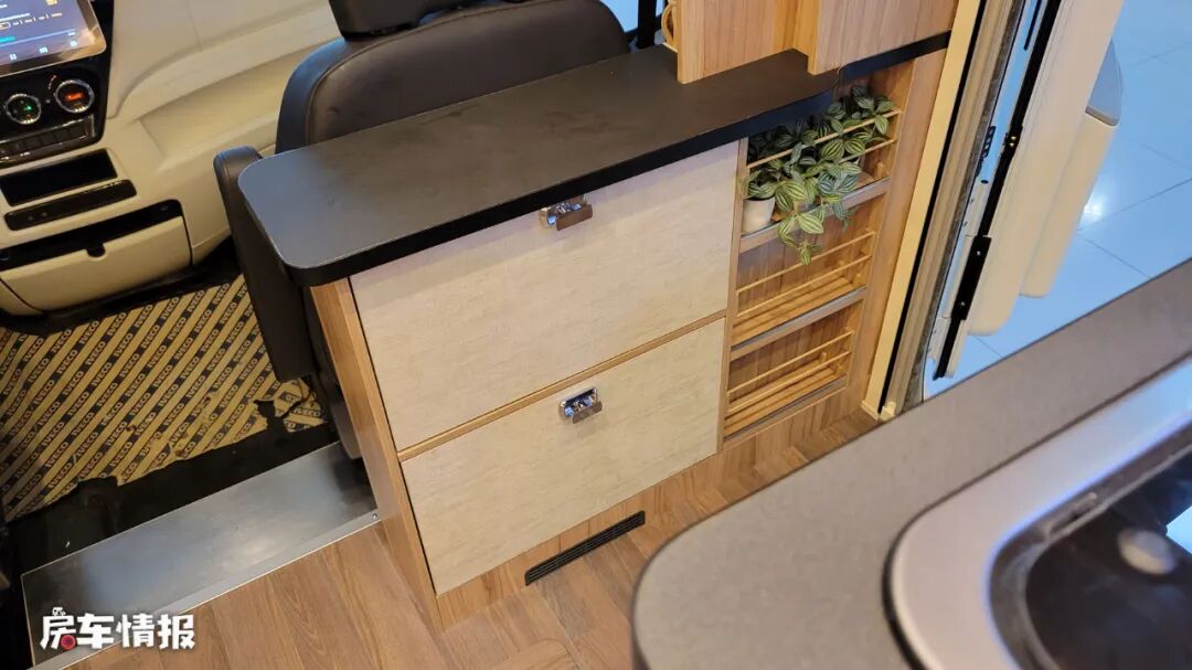 在乘客门的前方,这款车是设计了一个小的玄关,带有一个翻折式的鞋柜和置物架,方便平时存放物品以及后期拿取。