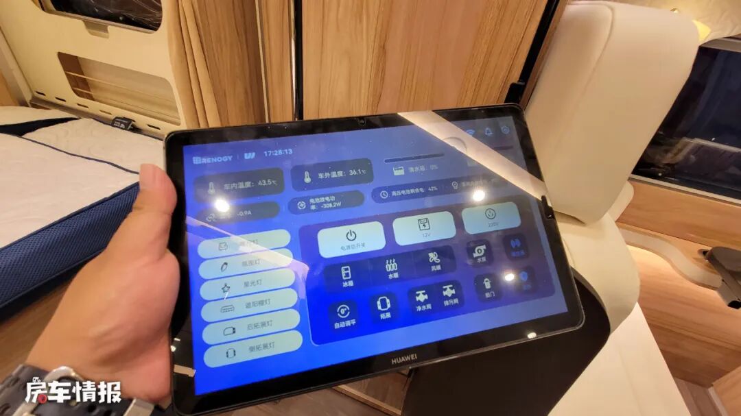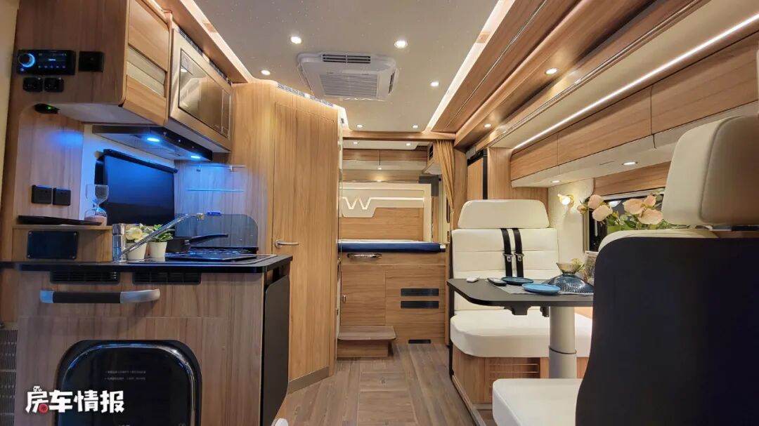 电路上,这款车是采用了双发电机的底盘,分别是180安和150安,另外全车是搭载了一个332伏的能量堆,可以在半小时之内为车内的18.6度电充到60%,而完全充满则只需要一个小时,其中12伏的最大输出功率为3000瓦,220伏最大输出功率则为6600瓦,另外在车辆顶部还配置了580瓦的如果新能源太阳能电池板以及280瓦的如果新能源外拓太阳能电池板,采用单晶硅足功率的太阳能电池板可以为房车电力提供更多保障,同时还带有五年的质保服务。