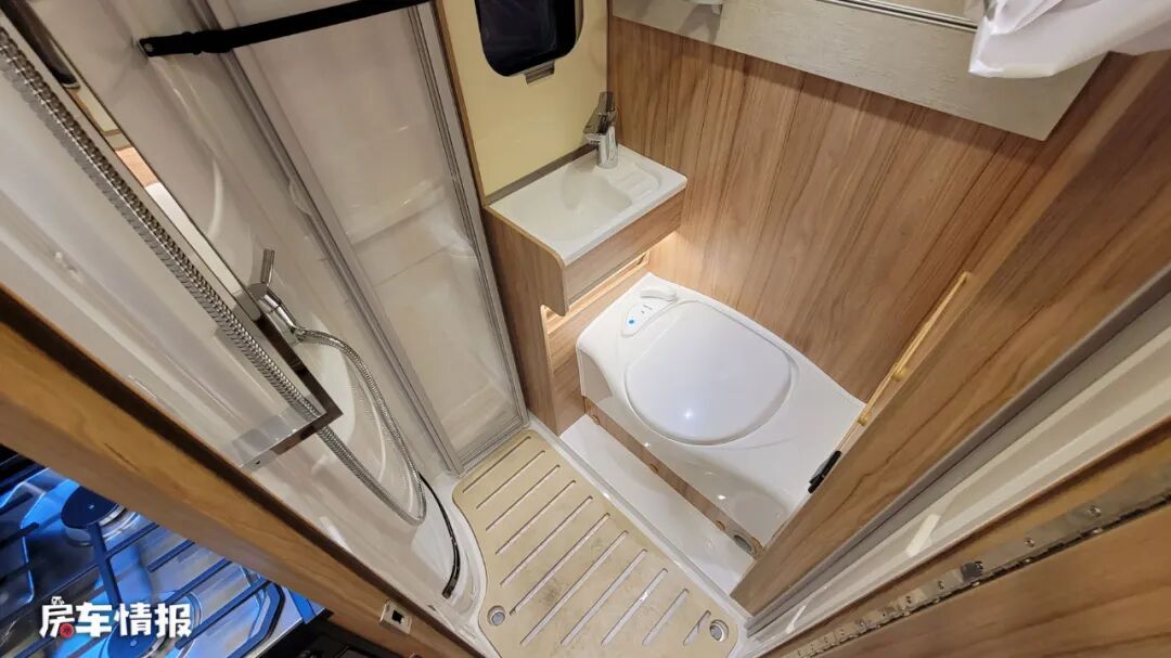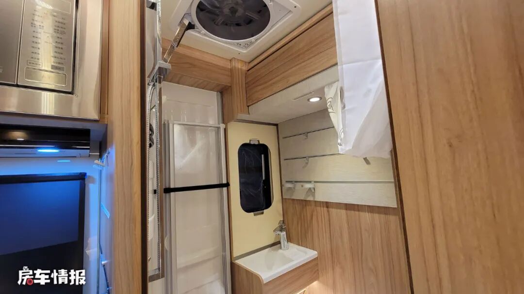 车内的卫浴室设计的还是非常有品质的,整体采用了吸塑式的设计,可以有效的防潮防水,并且内部是干湿分离的设计,配有固定的马桶、洗手台盆、淋浴花洒、换气扇等,能够满足日常的洗漱需求。