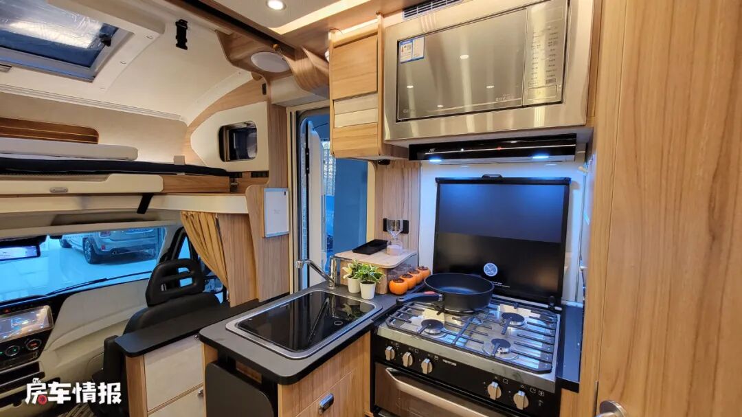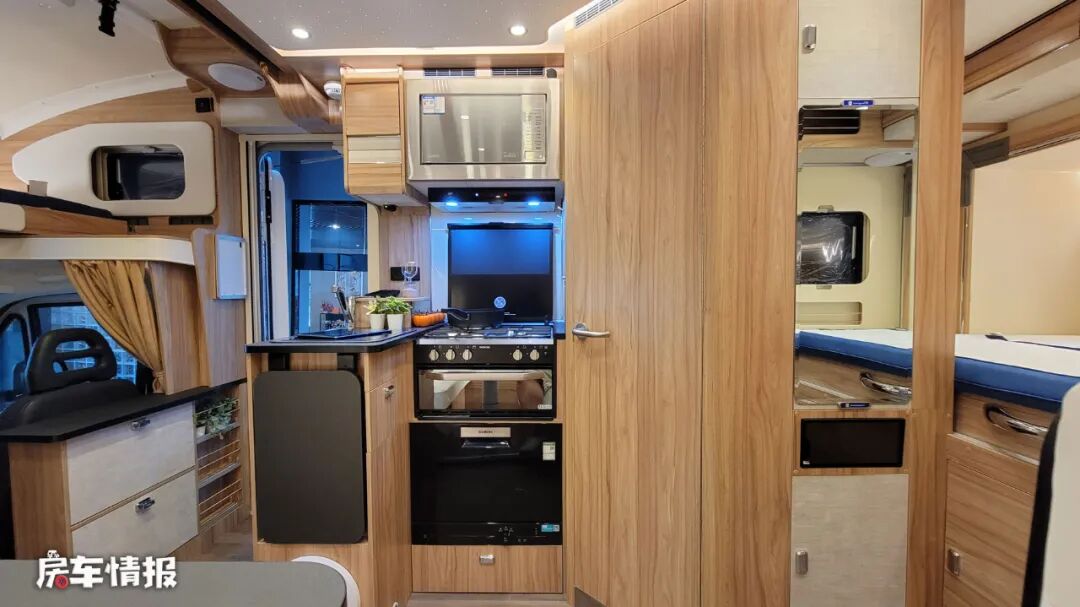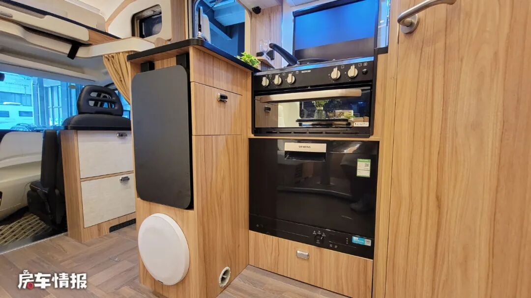 全车的厨房操作台是打造成了一个L型的吧台,整体是提供了微波炉、抽油烟机、气电两用灶台、不锈钢水槽、烤箱、洗碗机,可以说配置是相当丰富齐全了,足以满足日常的烹饪所需。
