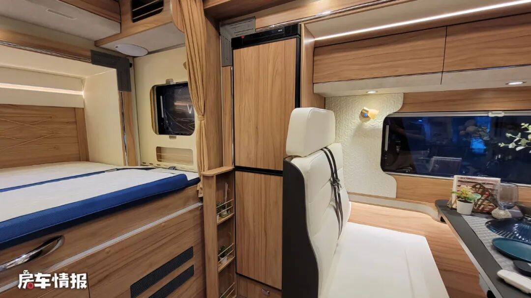 全车的冰箱则是位于会客沙发后方,为一台双开门大容积的冰箱,能够满足日常分类存放食材的需求。