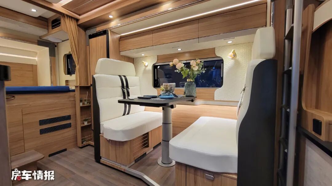 作为一款可以核载6个人的车型,车内的侧拓展舱内是采用了经典的四人对卡座沙发+升降餐桌的设计,行车时能够乘坐,驻车时可以用餐小憩,晚上还能够拼接成一张小型的卡座沙发床,可以容纳两个小朋友使用。