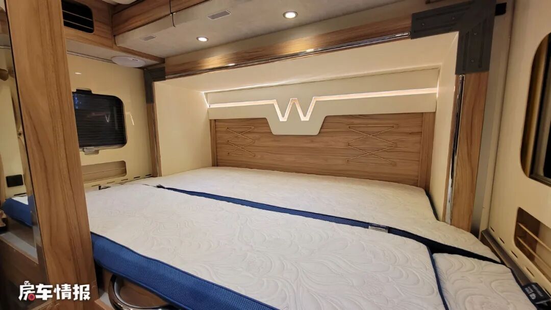 最后就是位于车厢尾部的横置双人床了,得益于后拓展的设计,内部的整体空间还不错,尺寸可以达到2000*1300毫米,也能容纳两个成年人使用。