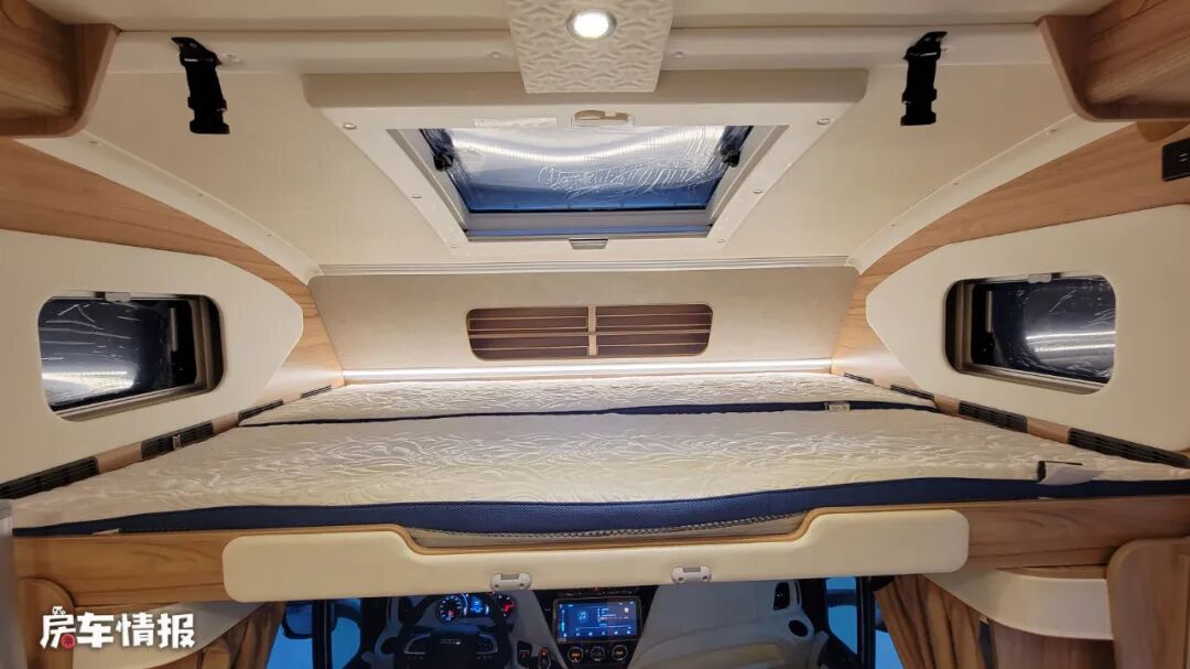 除去这张卡座沙发床,在最前方即使是顶部,还带有一张抽拉式的额头床,可以有效的增加下方驾驶室的头部空间,整体采用三面环窗的设计,尺寸为2100*1300毫米,能够满足两个成年人的休息需求。