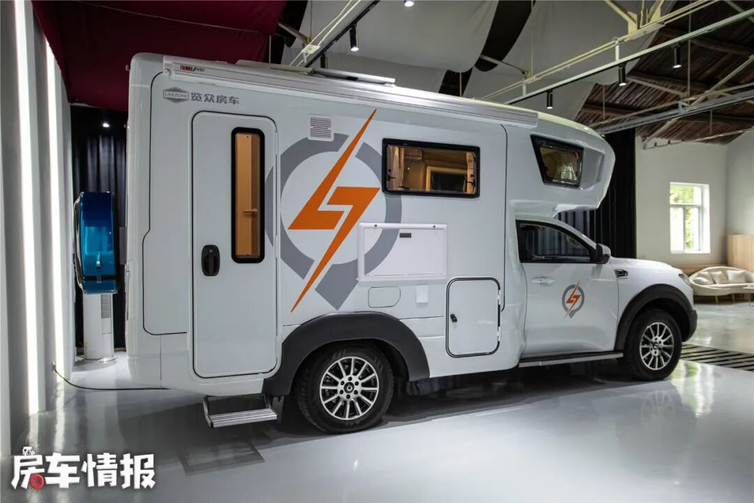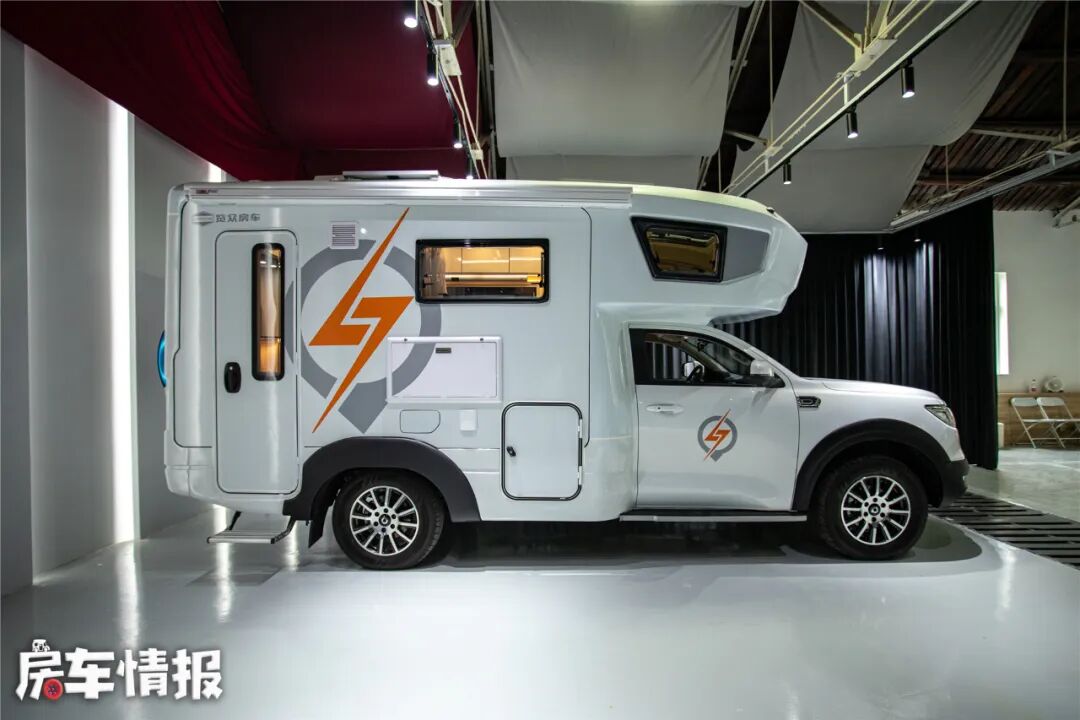 车身外部提供了比较丰富的外部设备,遮阳棚、置物翻板、自吸加水口、抽拉燃油灶等一应俱全,基本上可以满足日常的使用所需。车身左侧还加入了一个新能源充电口,提高了旅行中的充电效率。