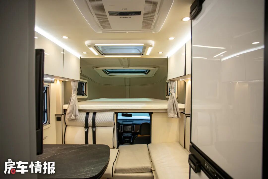第二张床就是对卡座+条形沙发拼成的沙发床,尺寸达到了1.9m*1.4m。大空间的实用感受,也是完全符合其产品定位,更亲近家庭的旗舰布局,6人旅居皮卡房车。