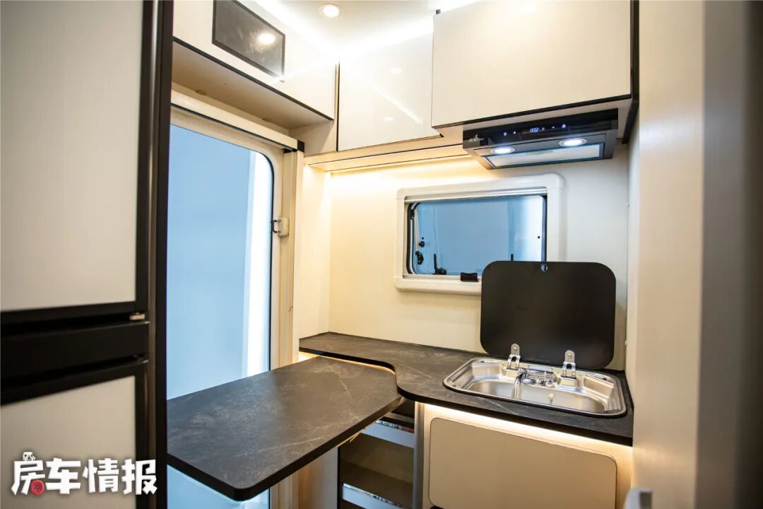车厢尾部是车内厨卫所在的位置,进门处是厨房操作区域,厨房下方还提供了一个拓展板,增加操作台的面积,厨房提供了抽油烟机、洗菜池、房车专用冰箱。
