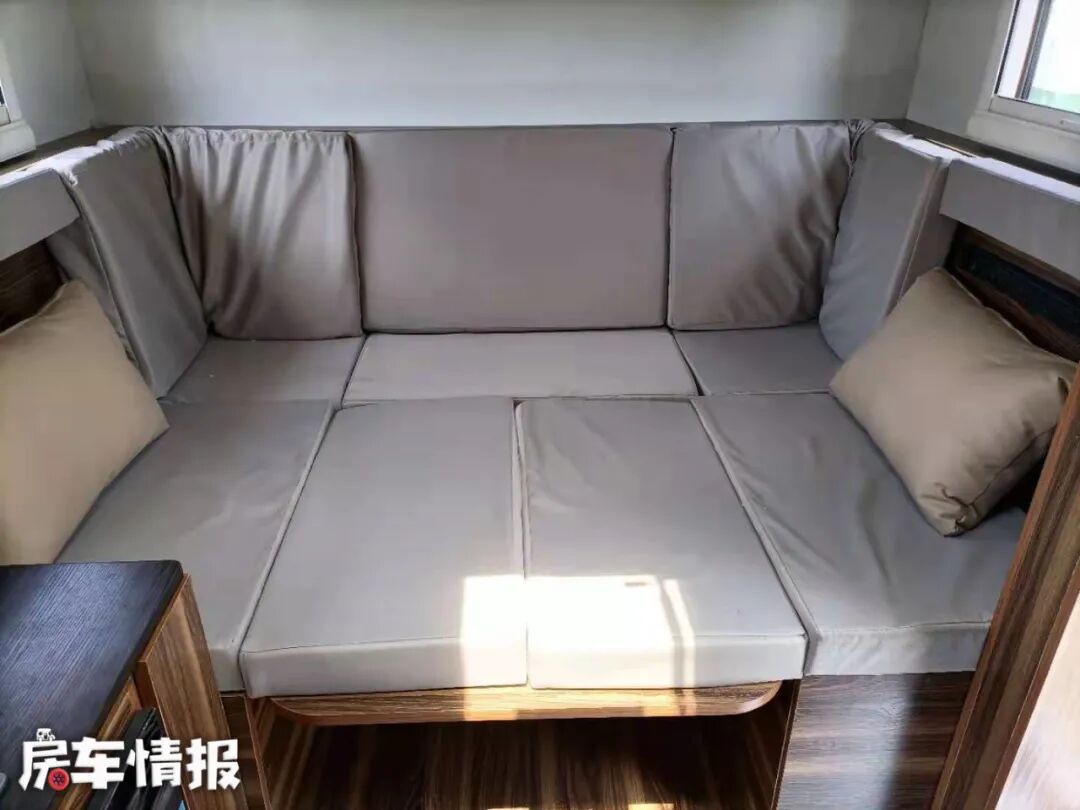 关于车内的设计,整体采用偏中式风的设计风格,给人的感觉比较沉稳,可根据实际需求选择4-6座,不过,大家要注意的是无论选择几座,这类B型房车最佳使用人数就是2人。